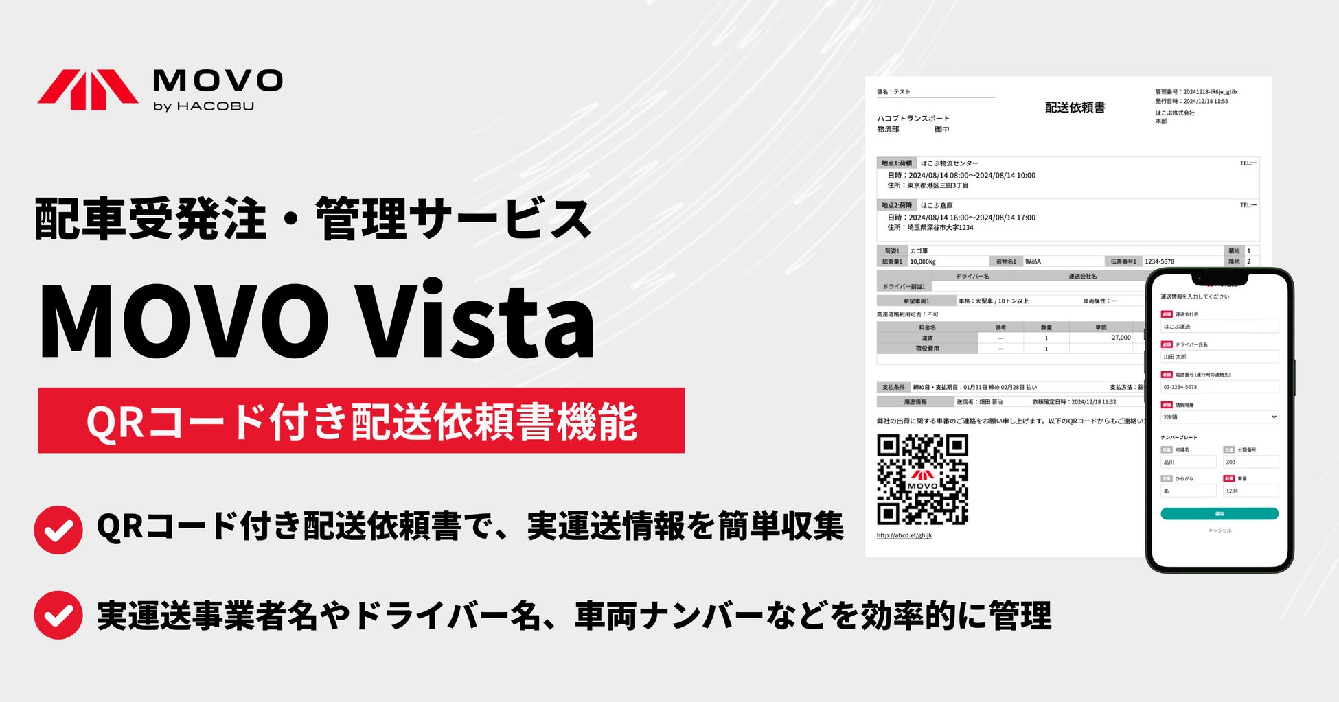 データの力で物流課題を解決する株式会社Hacobu(本社:東京都港区、代表取締役社長CEO 佐々木 太郎)は、配車受発注・管理サービス「MOVO Vista(ムーボ・ヴィスタ)」において、QRコード付き配送依頼書による実運送情報収集機能の提供を開始しました。運送事業者はアカウント登録不要でQRコードから実運送事業者名、ドライバー名、車両ナンバーなどの情報を簡単に登録でき、元請事業者は効率的に情報を一元管理できます。