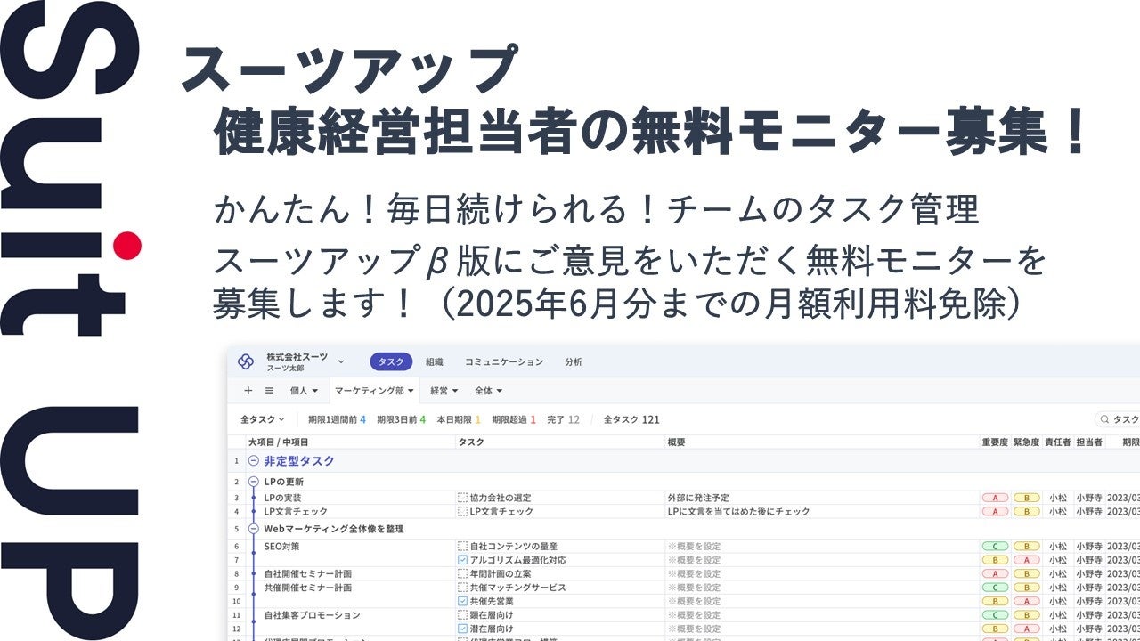 株式会社スーツ(所在地:東京都千代田区、代表取締役社長CEO:小松 裕介)は、チームでかんたん、毎日続けられるプロジェクト・タスク管理ツールの経営支援クラウド「Suit UP」(スーツアップ)において、健康経営担当者の無料モニターを募集いたします。