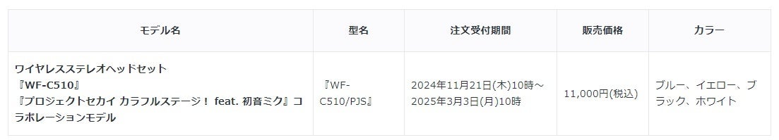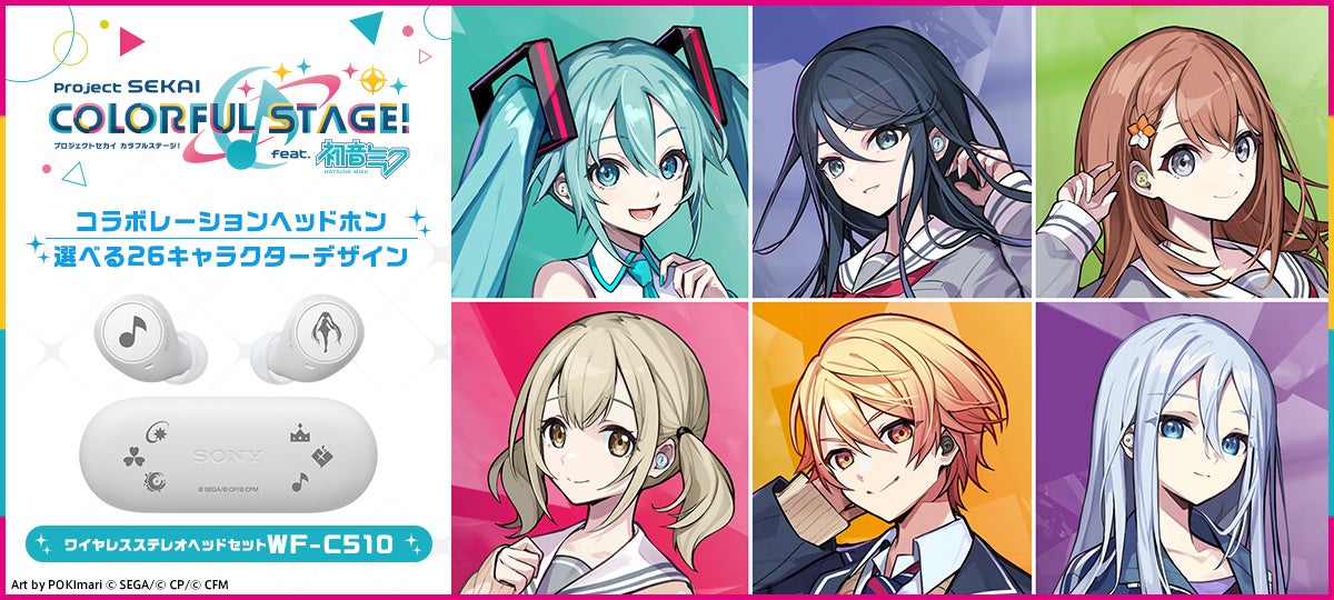 ソニーマーケティング株式会社は、『プロジェクトセカイ カラフルステージ! feat. 初音ミク』コラボレーションヘッドホンのWeb注文受付を、本日11月21日(木)から開始します。今回注文受付を開始するのは、ソニーストアのオリジナルデザインを刻印したワイヤレスステレオヘッドセット『WF-C510』に、購入特典が付属したモデルです。なお、本コラボレーションモデルは、アニメグッズ専門店「アニメイト」でも販売します。