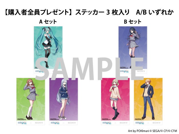 『プロジェクトセカイ カラフルステージ! feat. 初音ミク』に登場する各ユニットのメンバー(初音ミク、星乃一歌、花里みのり、小豆沢こはね、天馬司、宵崎奏)それぞれの全身ステッカーです。商品1点ご購入につき、キャラクターのステッカー3枚がセットになったAセット、Bセットいずれかをランダムで1セットプレゼントします。(*7)