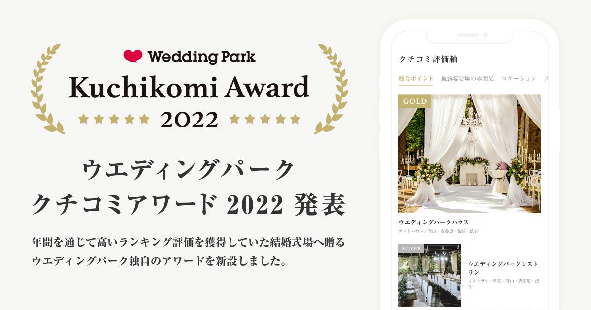 株式会社ウエディングパーク(本社:東京都港区、代表取締役社長:日紫喜 誠吾 以下ウエディングパーク)が運営する、結婚準備クチコミ情報サイト「Wedding Park」は、年間を通してユーザーから高い評価を得ていた結婚式場を表彰する「Wedding Park Kuchikomi Award 2022(ウエディングパーク クチコミアワード)」を発表、スペシャルページを2022年4月1日にリリースいたしました。