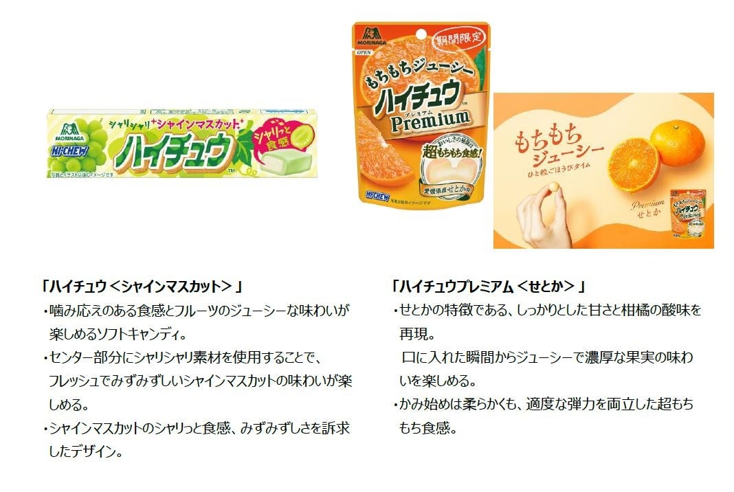 「ハイチュウ」は1975年の発売以来、心地よい食感とフルーツのジューシーな味わいで、長きにわたり多くのお客様にご愛顧いただいております。今回の「ハイチュウ<シャインマスカット>」は、昨年発売しご好評いただいた”シャインマスカット味“をリニューアルし、さらにおいしく仕立てました。シャリっとした食感と、みずみずしいシャインマスカットの味わいを楽しめます。「ハイチュウプレミアム<せとか>」は、みかんの大トロとも呼ばれる高級ブランドの「せとか」を使用することで、贅沢な果汁感を感じられる、プレミアム品質のハイチュウにぴったりな味わいに仕上げました。濃厚でジューシーなフルーツの味わいを楽しめる商品の発売により、お客様に笑顔をお届けしてまいります。