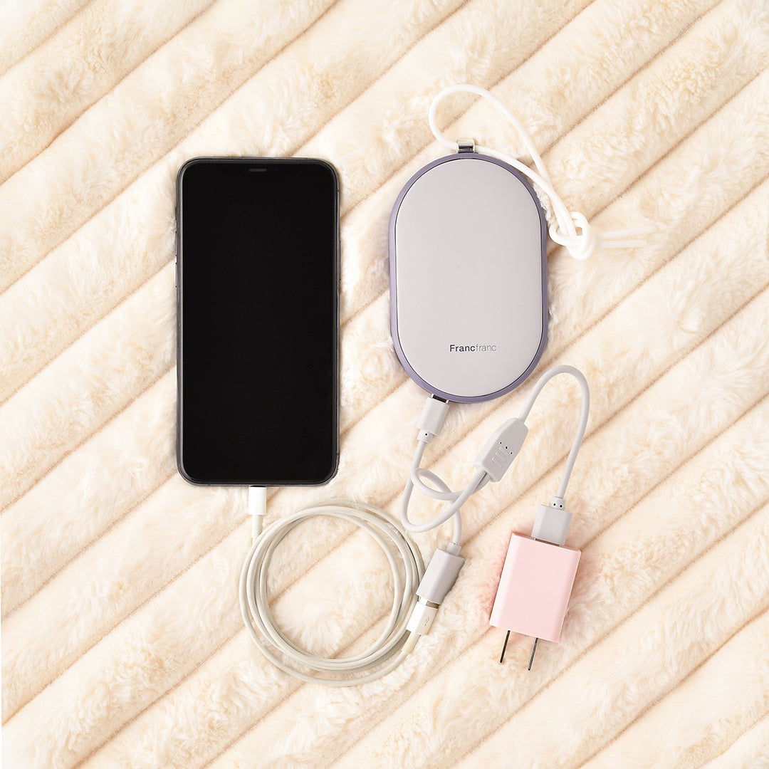充電式で繰り返し使えるので経済的で、モバイルバッテリーとしても利用可能な一台二役のカイロです。ころんとした形がかわいいオーバルの本体は手に馴染みやすく、手のひらサイズで厚さも1.5cmの薄型なので通勤や通学、おでかけする時のミニバッグでもかさばりません。持ち運びに便利な付属の巾着バッグは稼働中に熱さを抑えたい時のカバーとしても使えます。シリコンの紐を手首に通せば、道を歩いている時や電車やバスの座席から立ち上がる時も手元から滑り落ちずに安心です。