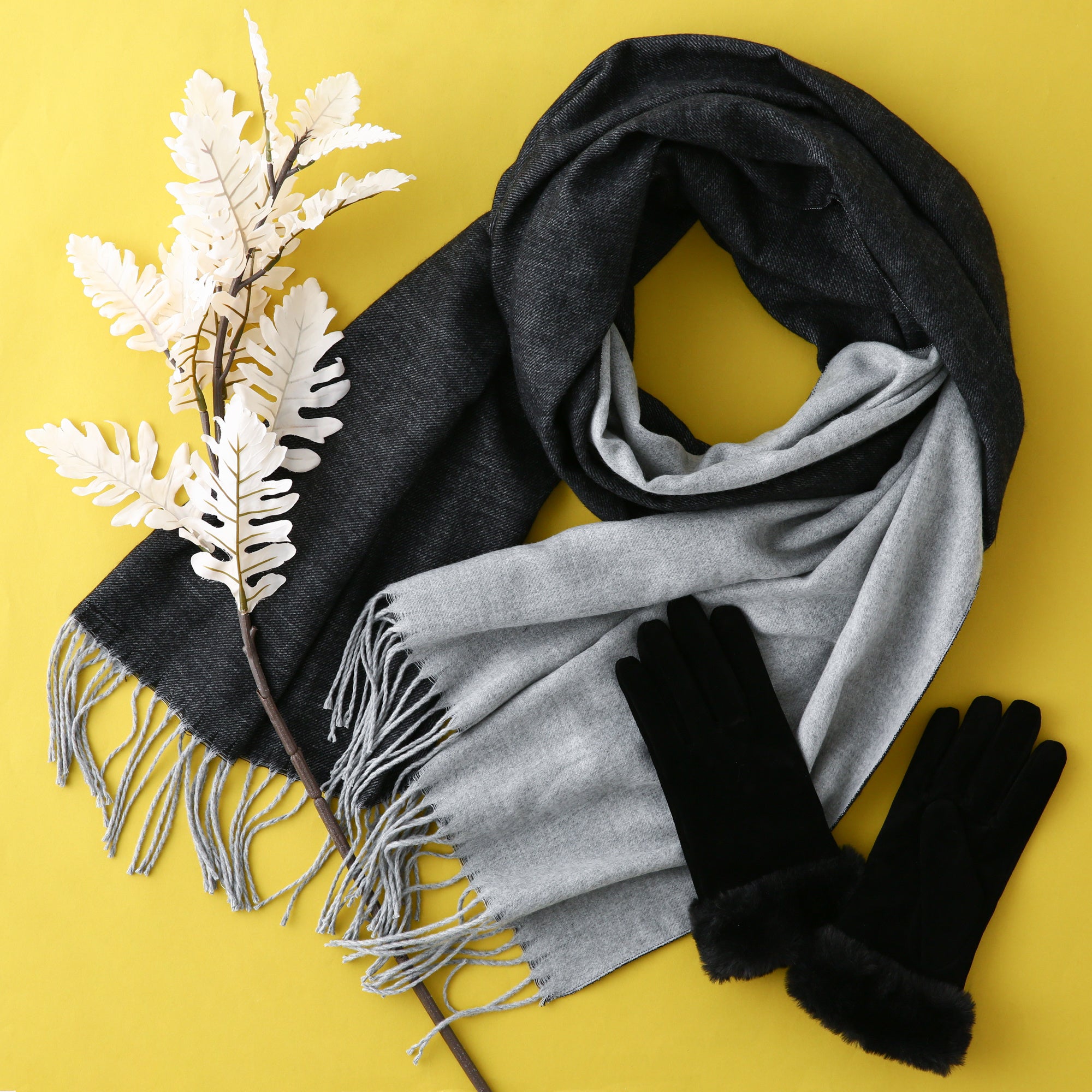 大判タイプのマフラーと柔らかなピッグスエードを使用したグローブです。首に巻いたり、羽織ったり、ひざ掛けとして使ったり、アイデア次第でマルチに活躍するマフラーはコーディネートにあわせてカラーを選べるリバーシブルタイプです。手首にエコファーをあしらったエレガントなデザインのグローブとあわせればフォーマルなおでかけ時にも活躍します。
