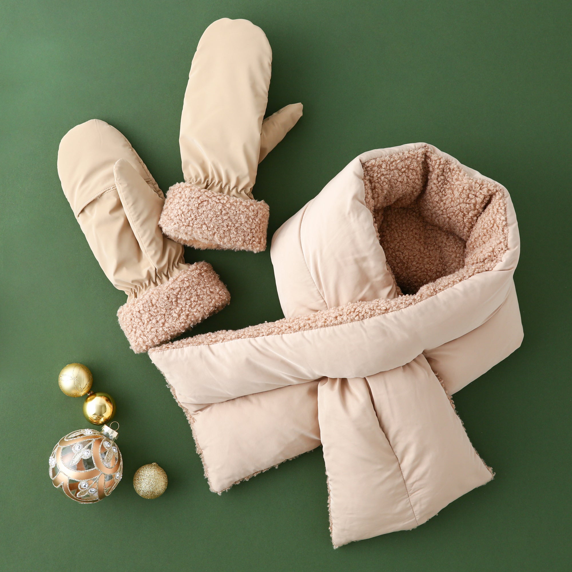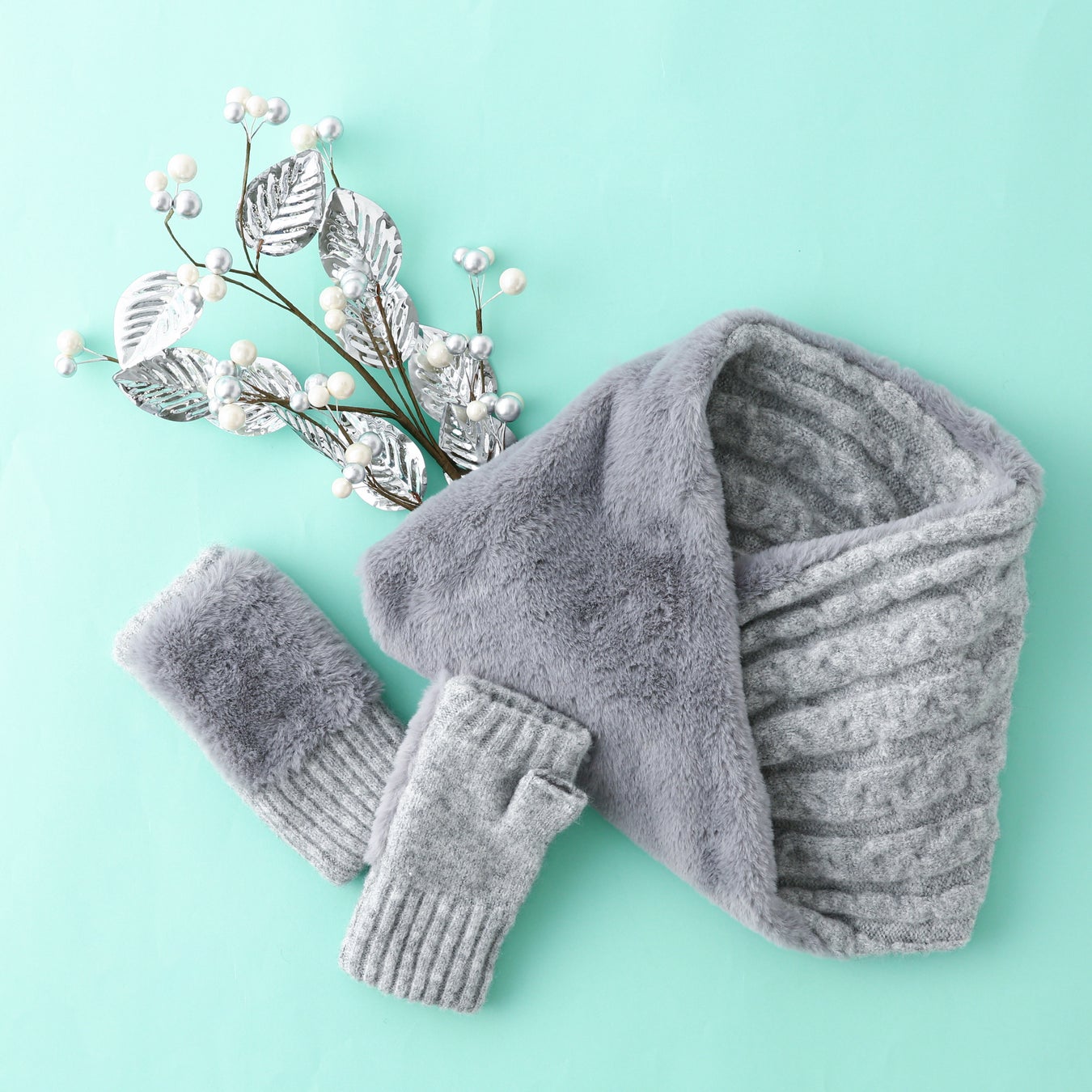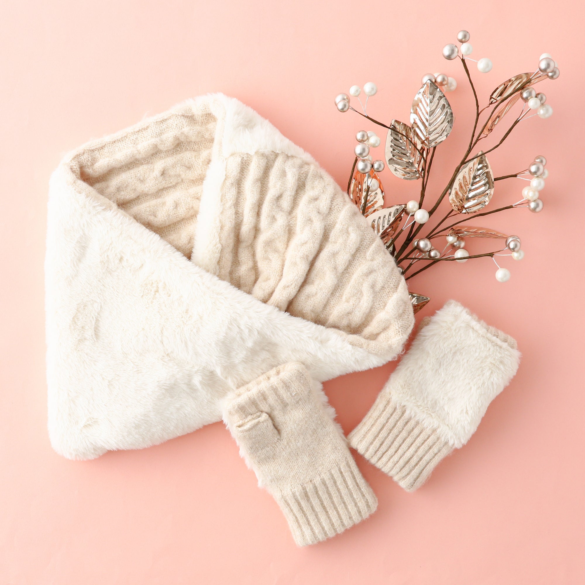 ニット&フェイクファーの異素材ミックスが可愛いスヌードとフィンガーレスタイプのグローブです。スヌードは立体感のあるねじりデザインなので、そのまますぽっとかぶるだけで形が決まります。グローブはつけたままでも、指先を使う細かな作業やスマートフォンの操作がしやすく便利でおでかけにもぴったりです。ふわふわファー素材ともこもこニット素材のコンビネーションが冬のコーディネートをキュートに彩ります。