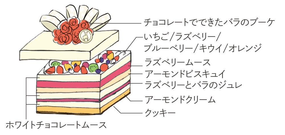 今年は、おとなのクリスマスに欠かせないホテル定番の“バラ”をイメージしたクリスマスケーキを3種類ご用意いたしました。昨年ご好評いただいたバラをモチーフにしたプレゼントボックス型の「カド- ミニョン」は、パティシエがひとつひとつ丁寧に手作りでバラを作りました。バラとボックスは、全て食べられるチョコレートで出来ており、最後の一口までお楽しみいただけます。ボックスを開けると、色とりどりのいちごやラズベリーなどのフルーツが敷き詰められ、ホワイトチョコレートやラズベリームースなどが何層にも重なったケーキです。