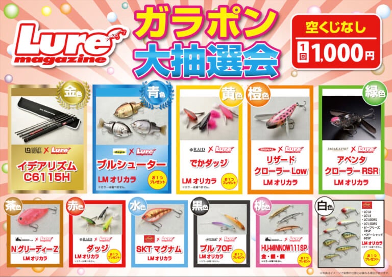 ルアマガも名物のガラポンをメインにレアものルアーを出品予定