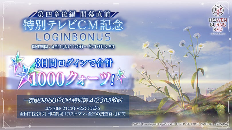 また、ゲーム内ではこの特別テレビCM放映を記念して、4月21日(金)より、3日間ログインすると合計で1,000クォーツを獲得できる「第四章後編 開幕直前 特別テレビCM記念ログインボーナス」を開催しています。