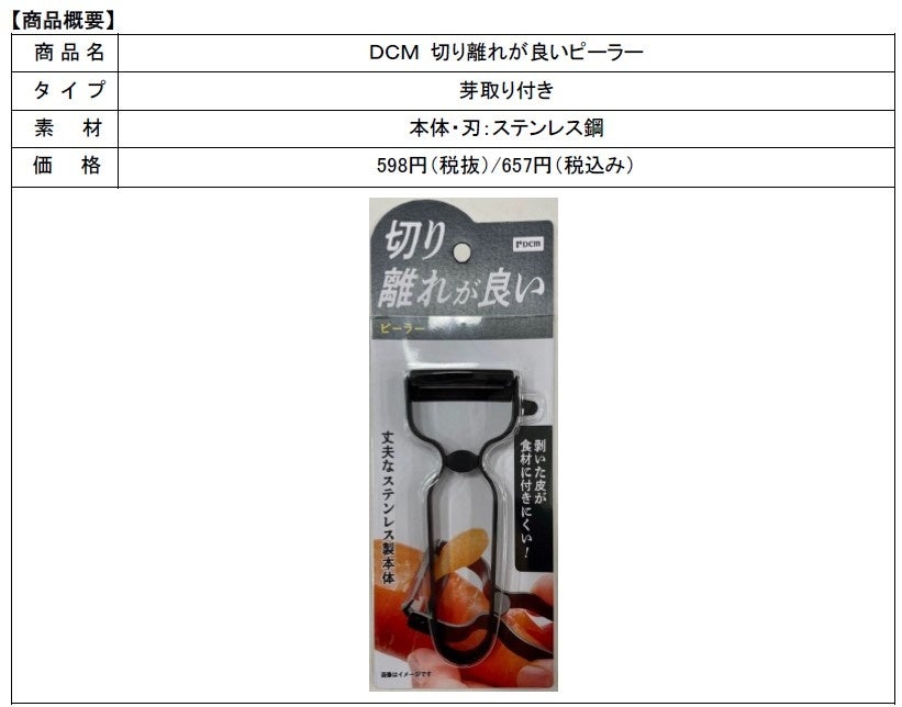 全国でホームセンター事業を展開するDCM株式会社(東京都品川区、代表取締役社長:石黒靖規、以下DCM)は、剥いた皮が食材に付きにくい「DCM 切り離れが良いピーラー」を、2023年1月20日(金)より全国のDCM・ケーヨーデイツー 店舗 一部店舗を除く)にて発売します 。
