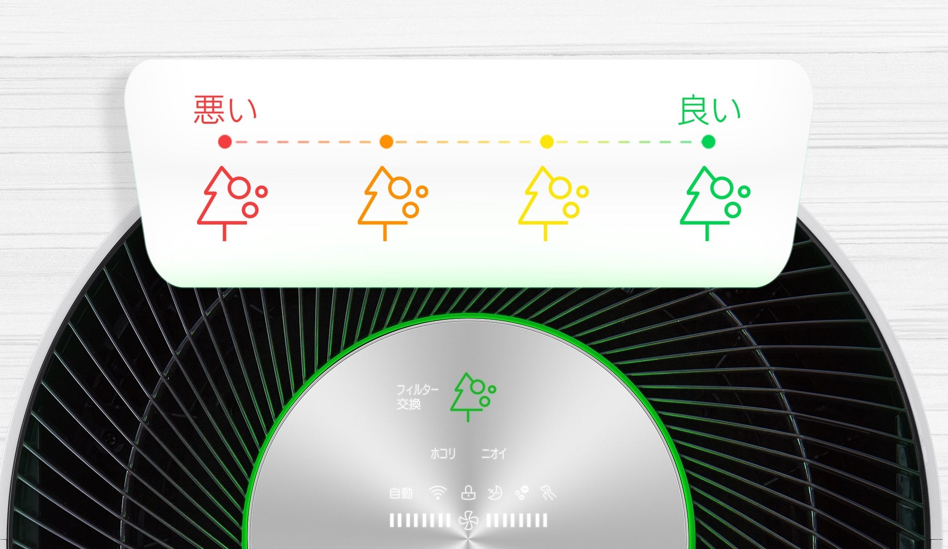 視認性に優れ、空気の状態が直感的にわかる「スマートディスプレイ」を搭載。ほこりやニオイの状況を、色とイラストで詳細に確認でき、いつでもキレイな空気を保つサポートをします。