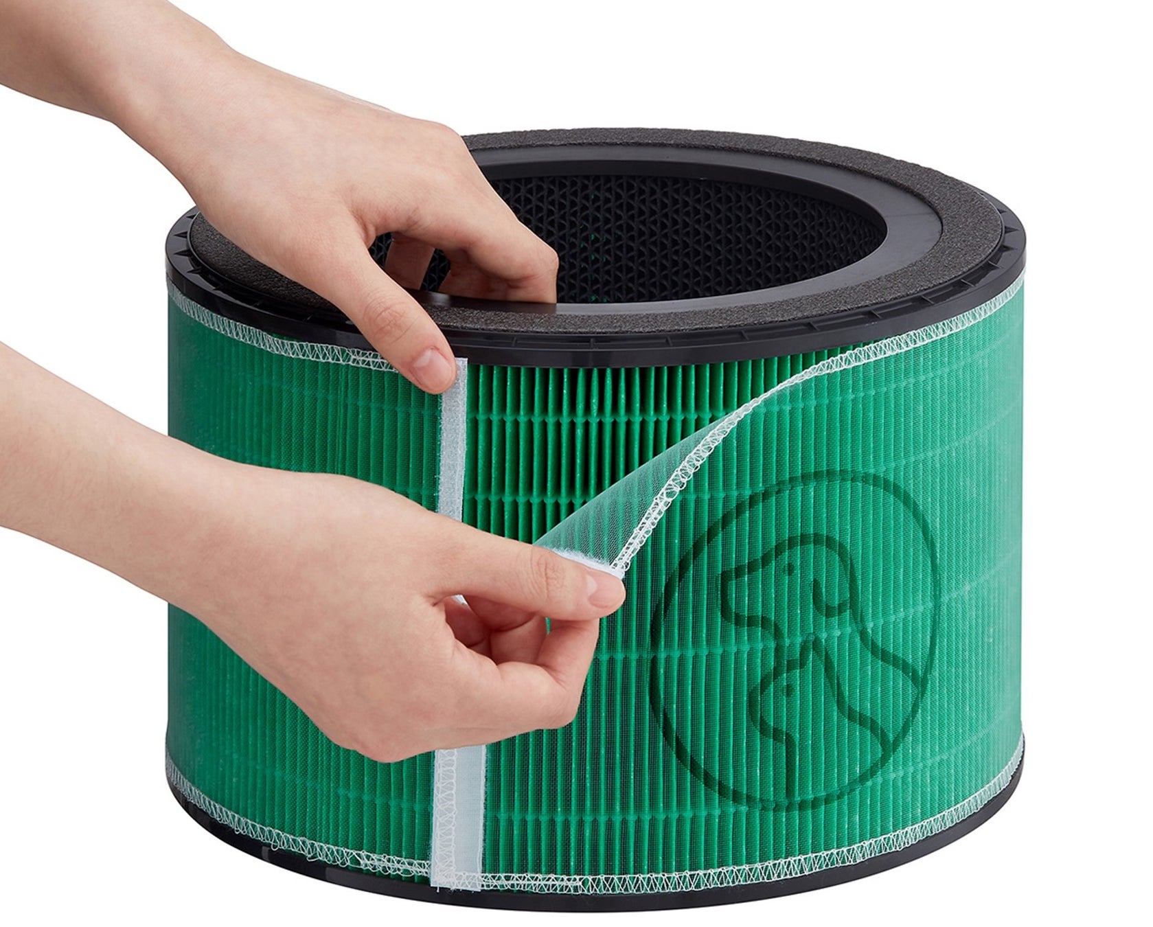 フィルター部には、①ペットの抜け毛やほこりを低減する抗菌プレフィルター、②PM2.5にも対応するHEPAフィルター、③ニオイをキャッチする光触媒(脱臭)フィルター、という3層フィルターを採用。プレフィルターは簡単に取り外すことができ、溜まった抜け毛やほこりも水洗いによって掃除が可能です。さらに光触媒(脱臭)フィルターは、脱臭性能が落ちた場合に、太陽光や蛍光灯などの光に充てると脱臭性能を復活させることができます。