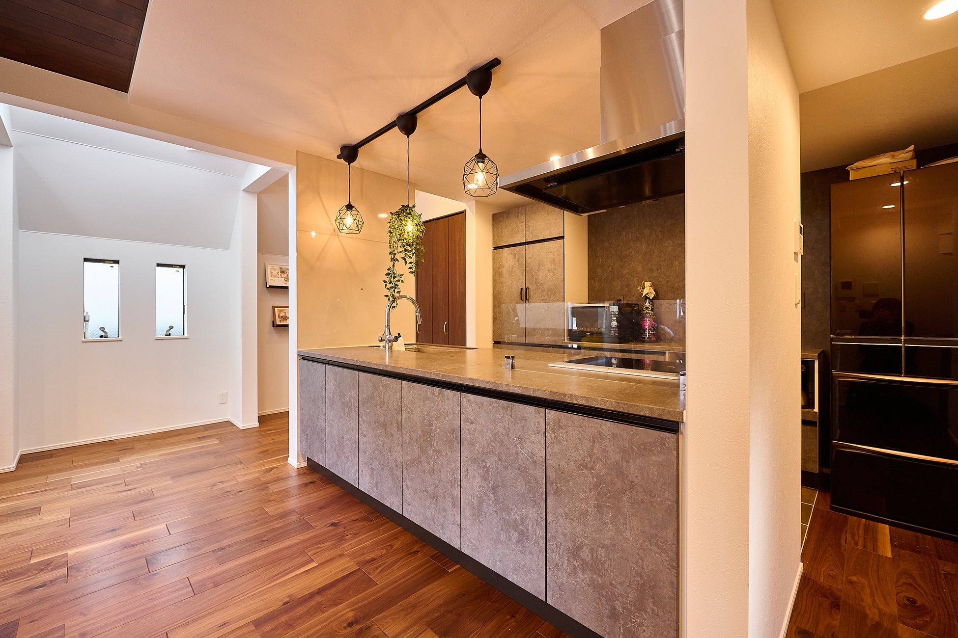 キッチンとダイニングを隔てる壁が少ない、天板か全てフラットな、オープンタイプのキッチンです。キッチンからの見通しが良くなり、開放的な空間が演出できるのに加え、料理中でもリビングとのスムーズなコミュニケーションが可能で、お子様のいらっしゃるご家庭や、来客の多いご家族にも人気です。LDKにこだわるお客様が多い中、キッチンそのものもインテリアの一部として扱われるようになってきています。