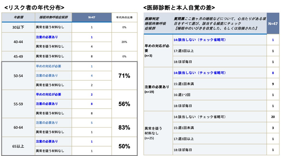 さらに、50代以上では睡眠時無呼吸症候群のリスクが50%以上とさらに高くなる傾向が見られました。