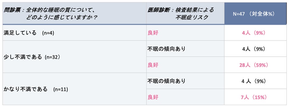 睡眠状態を自覚的に評価する質問票によると、睡眠の質について「少し不満である」「かなり不満である」が合計91%でした。一方で、脳波検査結果に基づく医師の評価では、睡眠状態が良好と判定された参加者が83%でした。
