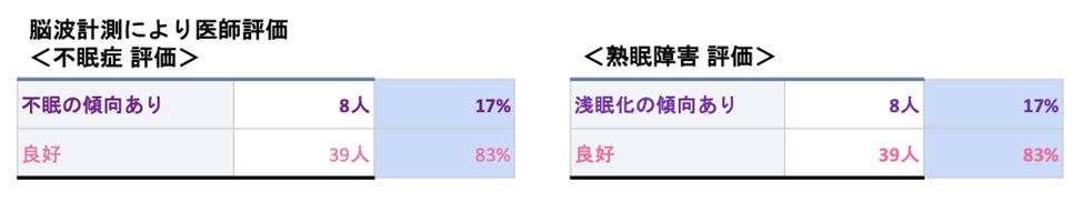 しかし、睡眠脳波計測によると、「熟眠障害」では8名(17%)のみが浅眠化の傾向があるが39名(83%)は良好な睡眠をとれていた。