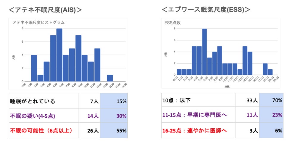 アテネ不眠尺度(AIS) ※2では「不眠症の可能性が高い26人(55%)」と「不眠の疑いがある14人(30%)」とで合計85%が不眠の可能性があるスコアとなり、エプワース眠気尺度(ESS) ※3では、早期に専門医への診察が11名(23%)に推奨され、さらに3名(6%)には速やかに医師診察の推奨スコアとなった。