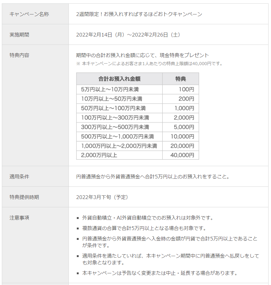本キャンペーンは、円普通預金から外貨普通預金へのお預入れ金額に応じて、現金特典をプレゼントするものです。お預入れすればするほど特典金額は多くなり、プレゼント金額は最大4万円です。