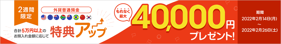 外貨普通預金のお預入れで最大4万円をプレゼントする「2週間限定!お預入れすればするほどおトクキャンペーン」を実施