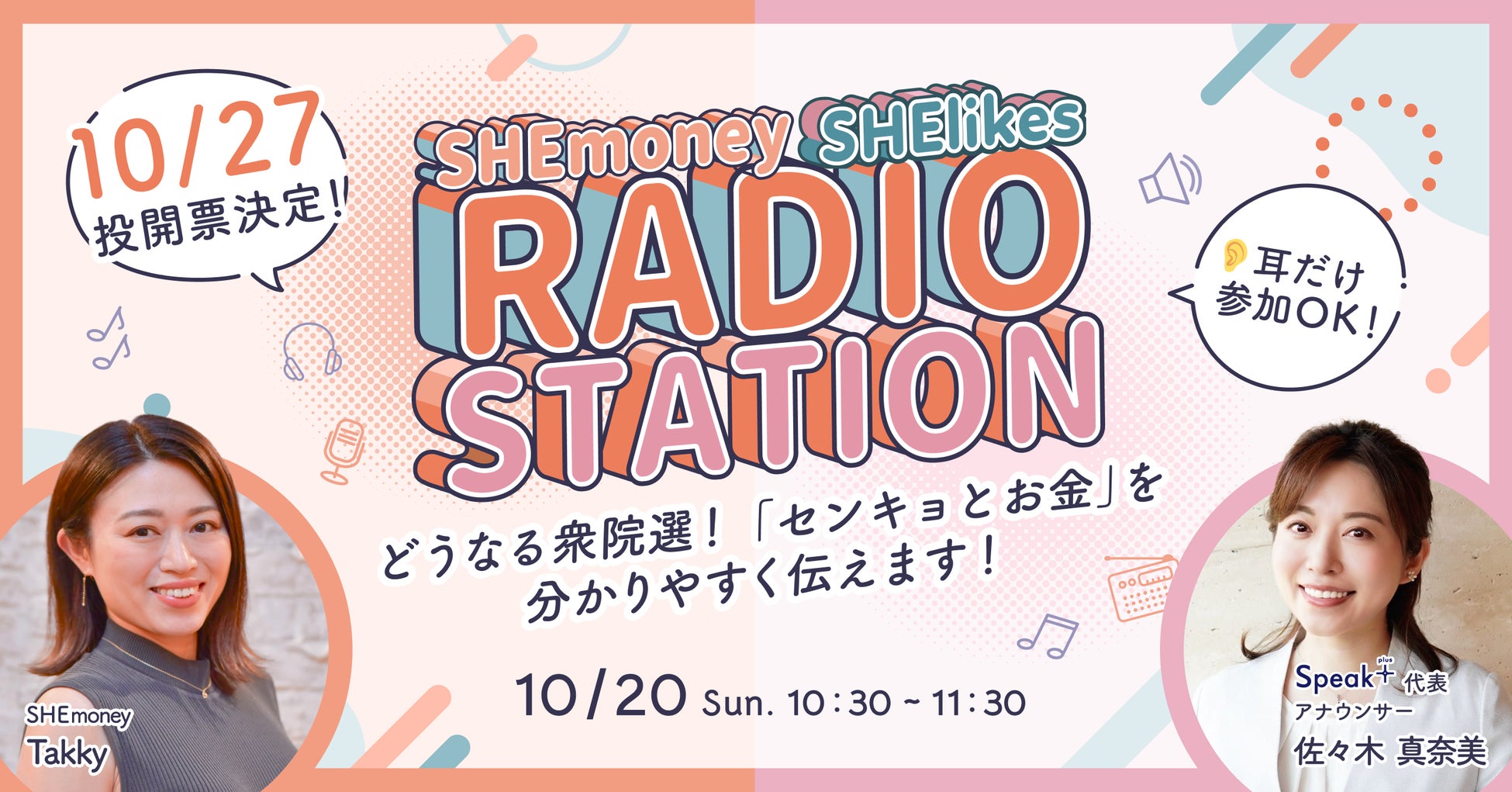 ・タイトル:【SHEmoney×SHElikes Radio Station】どうなる衆院選!「センキョとお金」を分かりやすく伝えます! 初心者にも分かりやすい、 政治や選挙にまつわるゆるっとラジオ