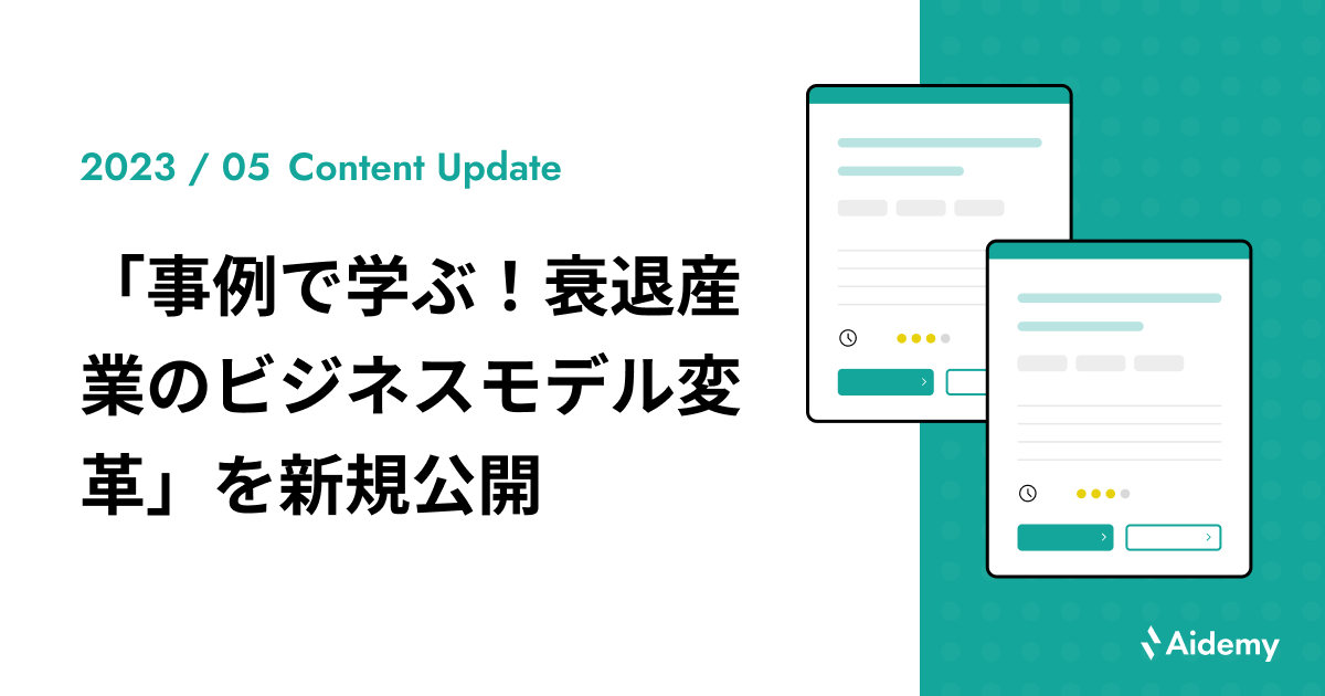 DX推進に向け、全社員教育に動き出す企業も増える昨今、ますますDX人材として求められる知識やスキルも多様化しています。このような動向を受け、アイデミーは、デジタルリテラシーを身に付けるために学ぶ方から、システム運用に携わる研究職の方まで、クライアントの多様なニーズに応えるべく、「Aidemy Business」の新規教材の開発と既存教材の改修を継続的に進めております。2023年5月は、数々の事例を通じてデジタル技術を活かしたビジネスモデル変革の必要性を理解するコース「事例で学ぶ!衰退産業のビジネスモデル変革」を29日にリリースいたしました。