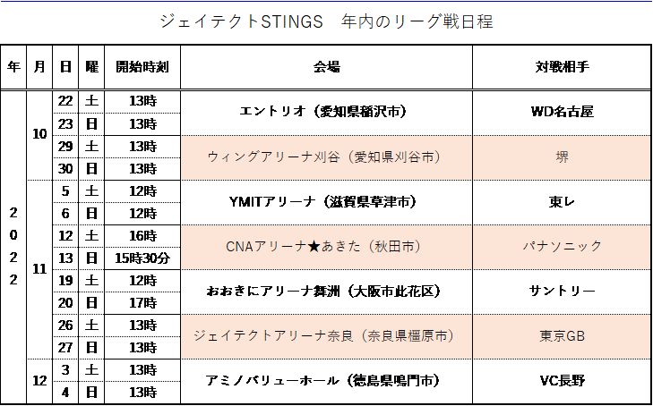 ジェイテクトSTINGSは10月22日午後1時から、豊田合成記念体育館エントリオ(愛知県稲沢市下津北山1丁目16番4)で、WD名古屋との今季初戦を迎えます。今後とも変わらぬご声援を賜りますよう、よろしくお願い申し上げます。