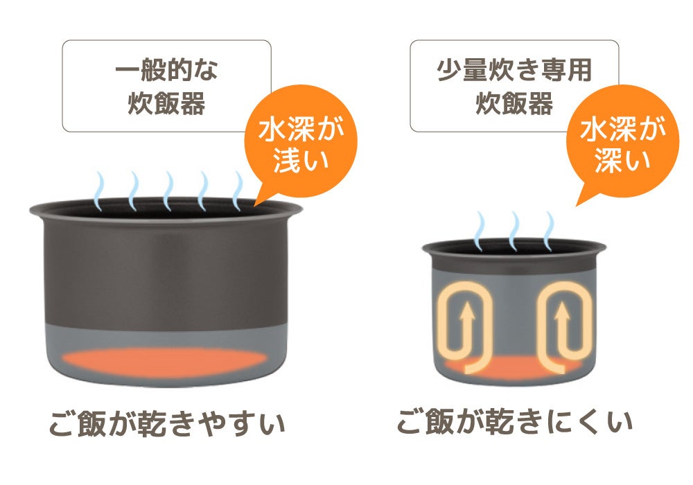 本製品のような少量炊き専用の炊飯器はコンパクトサイズなので、一般的な炊飯器と比べると、同じ量のお米とお水で炊飯した場合でも水深が深くなります。水深が深いと、沸騰した時に底から水面に向かって発生する対流が大きくなるので、お米が踊るような状態となり、一粒一粒がムラなくふっくらとおいしく炊き上がります。