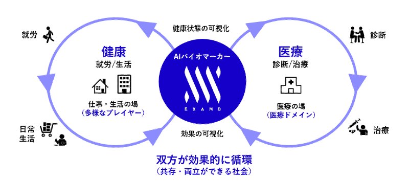 ExaMDは、エクサウィザーズから健康・医療領域のマルチモーダルAIプロダクト・サービスに関する事業を継承し、エクサウィザーズの100%子会社として2024年2月に設立しました。第一弾として、会話音声AIを活用した認知症診断支援のプログラム医療機器(SaMD)や、認知機能測定ソフトウェア(Non-SaMD※)などの開発を進めており、健康・医療の双方の市場に向けたAIサービスの開発を進めています。