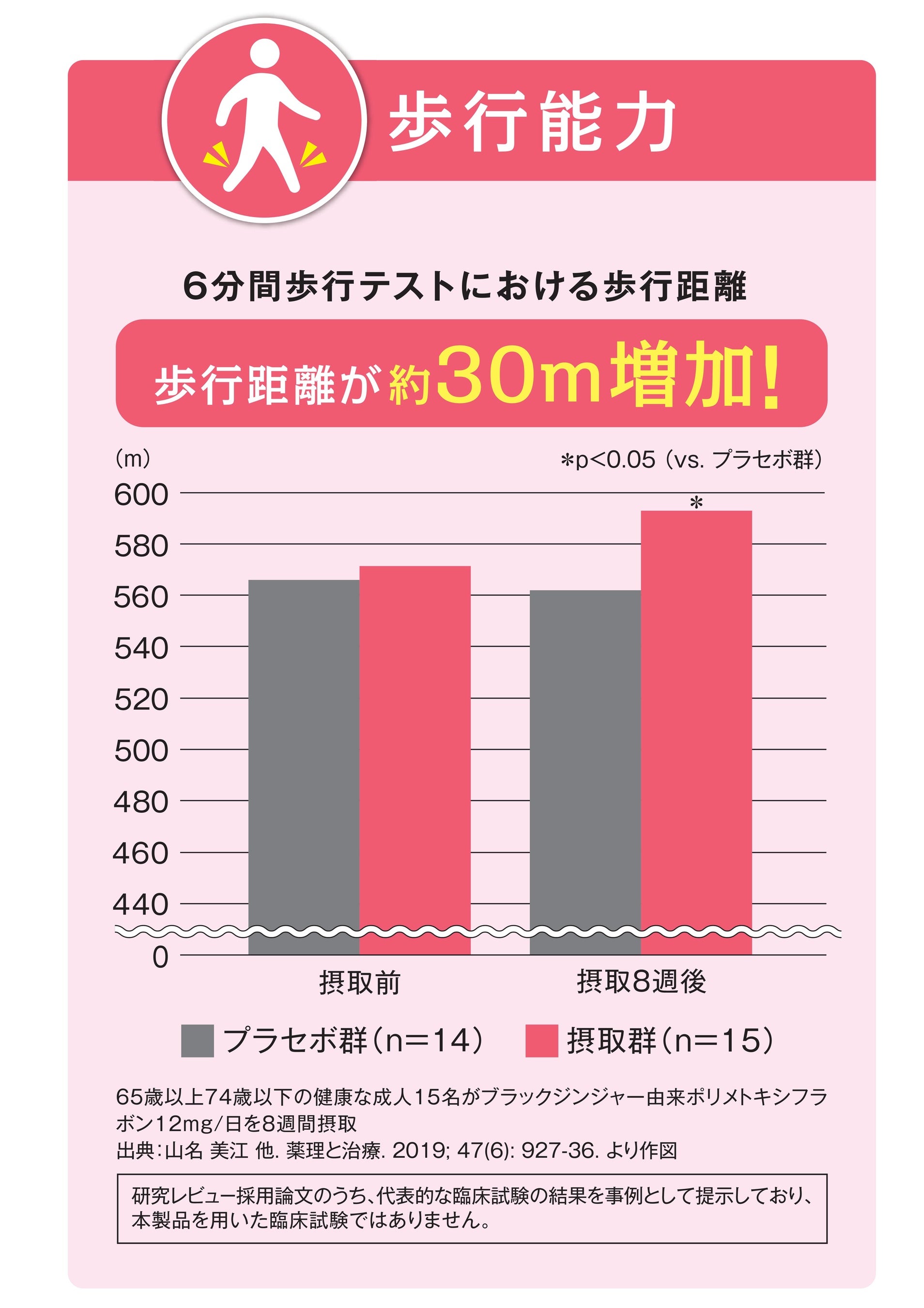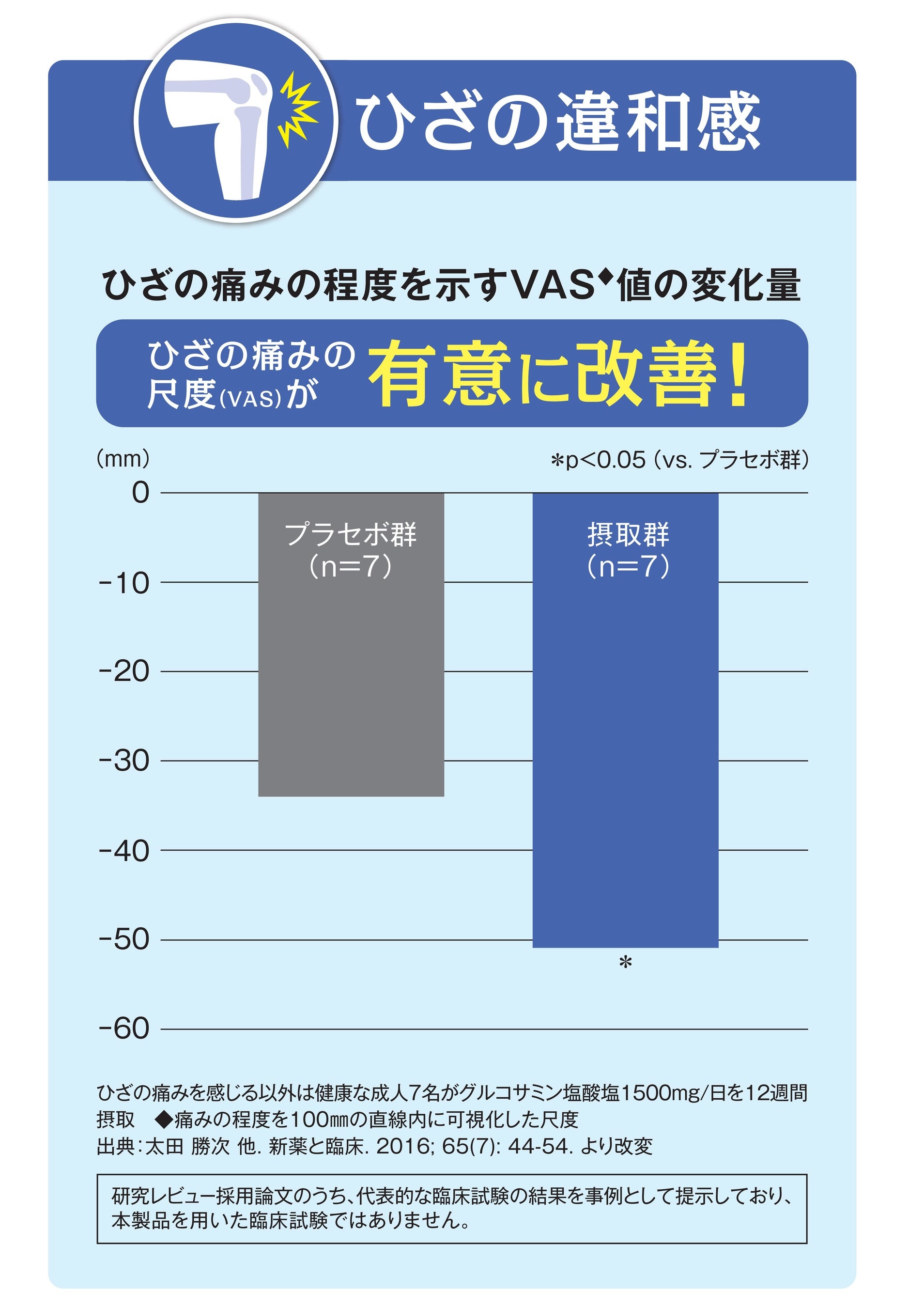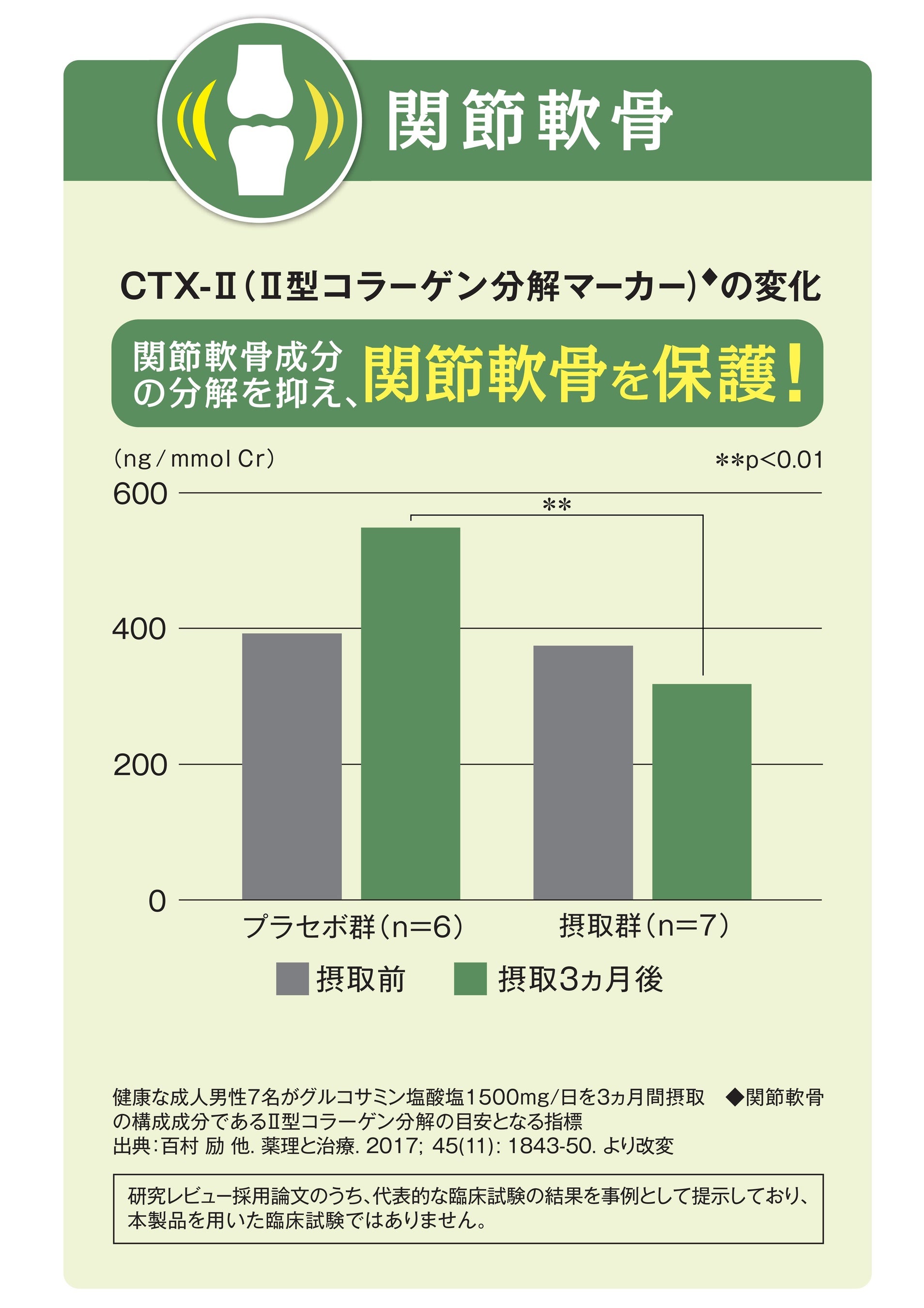 本品には、グルコサミン塩酸塩、ブラックジンジャー由来ポリメトキシフラボンが含まれます。 グルコサミン塩酸塩はひざ関節の曲げ伸ばしを円滑にし、 ひざの違和感を軽減する機能や、運動における過剰な軟骨成分の 分解を抑えることで、関節軟骨の正常な代謝を促すのに役立ち、 関節軟骨を保護する機能が報告されています。 ブラックジンジャー由来ポリメトキシフラボンは、 脚の曲げ伸ばし等の筋肉に軽い負荷がかかる運動との併用で、 年齢とともに低下する脚の筋力に作用することにより、 中高年の方の歩行能力の向上に役立つ機能が報告されています。 |
