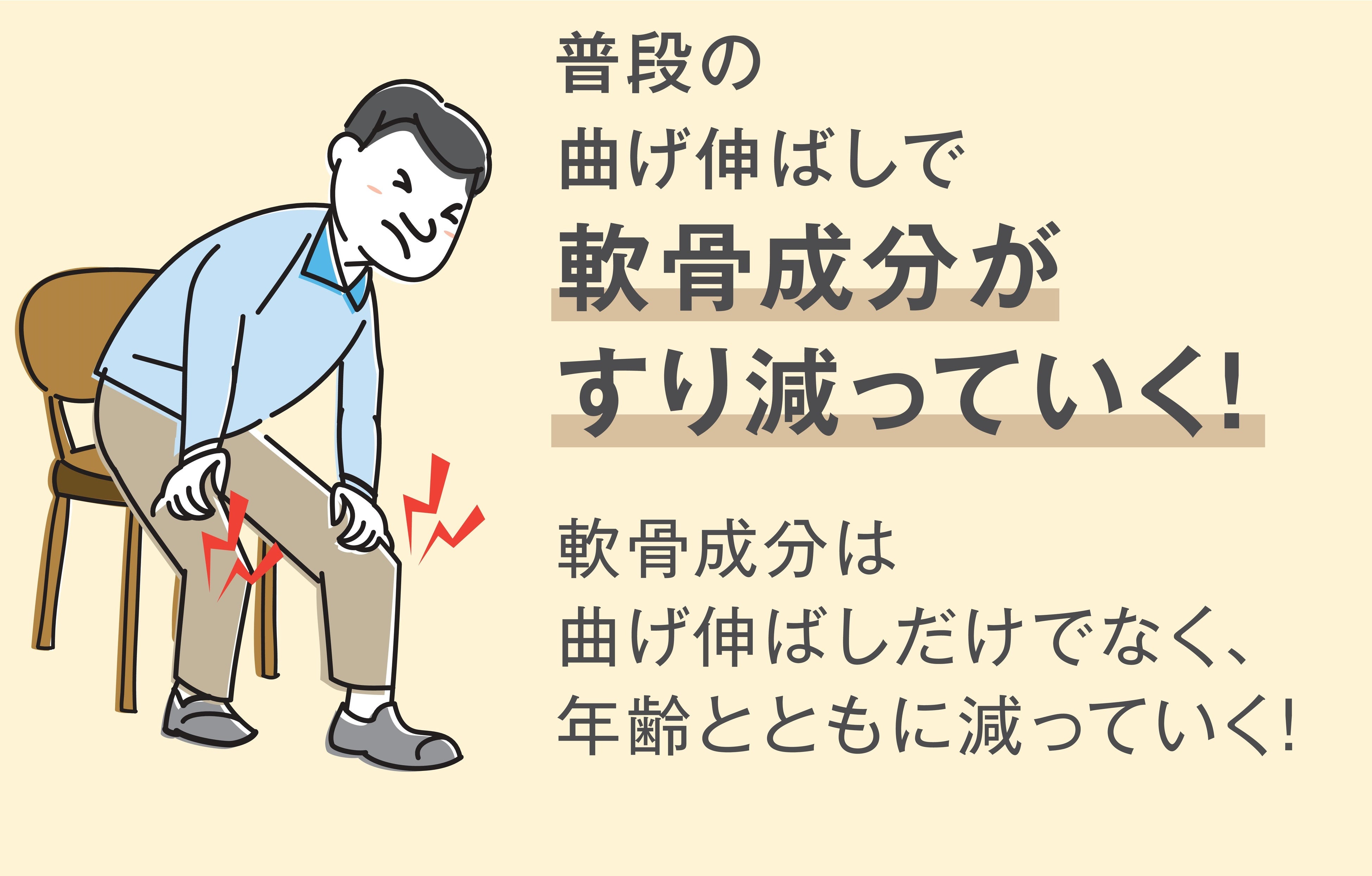 立つ・座る・歩くなどの日常の様々な動作はカラダのいたるところに関節があるからこそできること。関節は骨と骨が連結して構成されており、その骨の先端を覆っているのが軟骨です。軟骨はスムーズな動作を可能にするために、骨と骨がこすれ合う際の衝撃を減らし、クッションのような役割を果たしています。