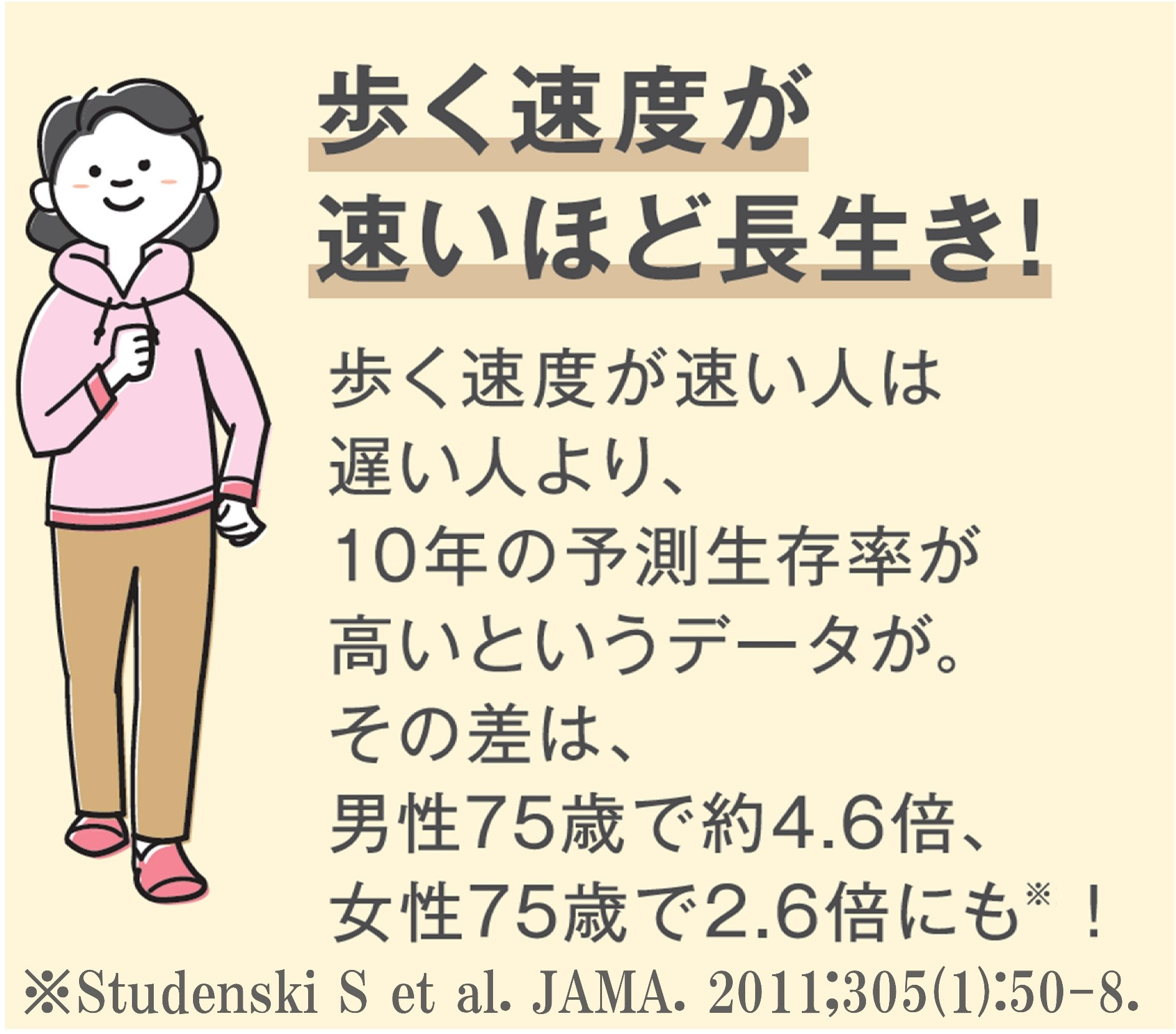 脚の筋力が減少することで、歩く速度の低下、つまずき・転倒、ひざの痛みなどに代表される歩行能力の衰えに繋がります。対策としては、支障をきたす前から生活の中でできる軽い運動を続け、筋肉量や筋力を保つ事が重要です。