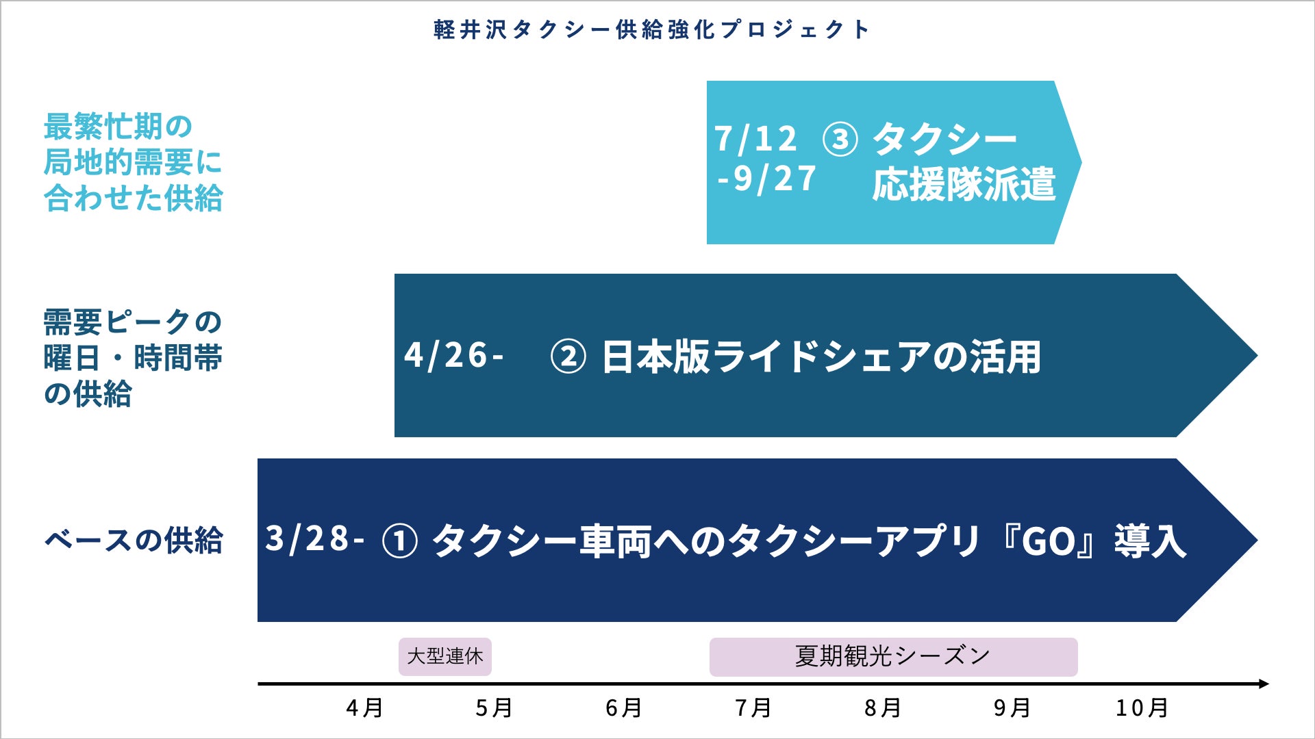 軽井沢町では、観光シーズン中の観光客増加が顕著となり、春の大型連休や7月から9月の夏季期間、11月の紅葉期間などの繁忙期間は移動需要が局地的に膨れ上がるため、観光客・地域住民共にラストワンマイルの移動が困難となっています。一方、地元タクシー事業者ではドライバー確保が困難な状況であること、また繁忙期と閑散期との需要変動が大きいことにより適正な車両台数の確保が難しい状況となっています。この課題を解決すべく、2024年2月に官民連携で連携協定を締結しスタートしたのが『軽井沢タクシー供給強化プロジェクト』です。下記を“3本の柱”とした複合的な施策によって、地域交通の担い手および移動手段を確保し、軽井沢町内のラストワンマイルの移動をより便利にする取り組みを推進しています。