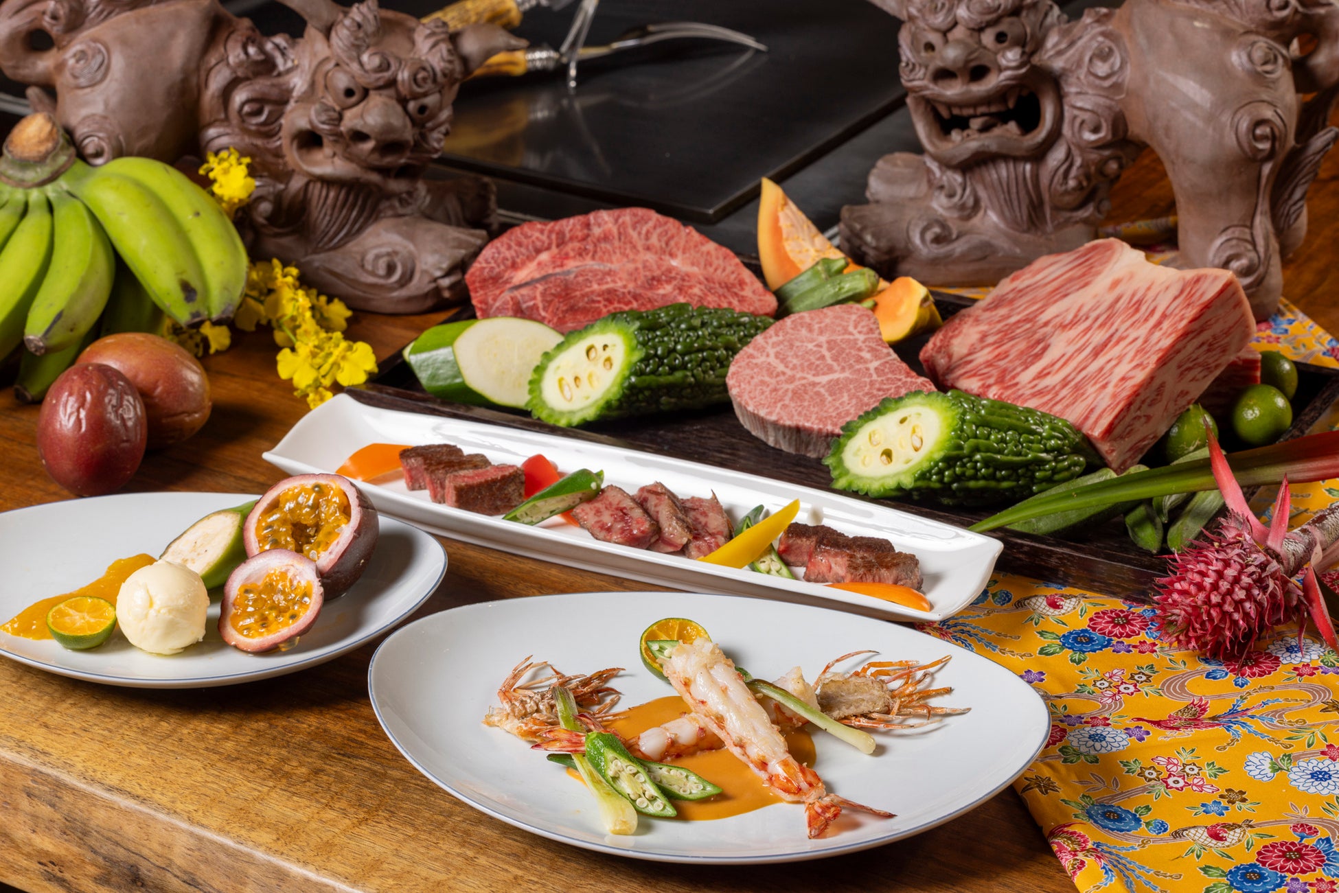 限定メニューには、石垣島の温暖な気候の中で育てられた良質な肉質と上品な味わいが特長の本島にはあまり流通しない希少な石垣牛をメインに、ミネラルが豊富な久米島の美しい海が育むしっかりとした甘みと歯ごたえが楽しめる車海老や、沖縄県産の高級魚「スジアラ」などでつくる料理の数々をご用意いたします。石垣牛は、舌の上でとろけるような柔らかな食感のテンダーロイン、ジューシーで上質な脂の甘みを感じるサーロイン、きめ細かな霜降りが入りコクと旨味が口の中で広がる希少部位のミスジ、3つの部位の食べ比べをお楽しみください。そのほか、ゴーヤや島らっきょう、沖縄県で不老長寿の薬草として重宝されてきたハンダマなどの沖縄伝統野菜を随所にちりばめ、沖縄の豊かな自然を感じるメニューに仕上げます。コースの締めくくりには、生産量が少なく希少価値の高いブランドマンゴー「夏小紅(なつこべに)」のデザートをご用意いたします。約20度と、通常のマンゴーに比べ非常に高い糖度が特徴の夏小紅の濃厚な甘みと、なめらかな舌ざわりをご堪能ください。