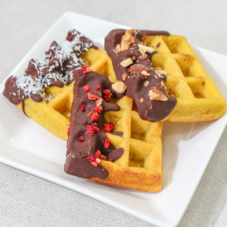今回登場する『米粉のかぼちゃワッフル』は、かぼちゃのやさしい甘さをぎゅっと閉じ込めたヴィーガン&グルテンフリーの米粉スイーツ。しっとりとした食感で、ほんのりやさしい甘み。ビターなチョコをまとわせ、甘さ控えめな仕上がりに。仕上げのトッピングは、ココナッツ、ローストアーモンド、フリーズドライいちごの3種からお好みでお選びいただけます。見た目も味も秋にぴったりなスイーツをお楽しみください。