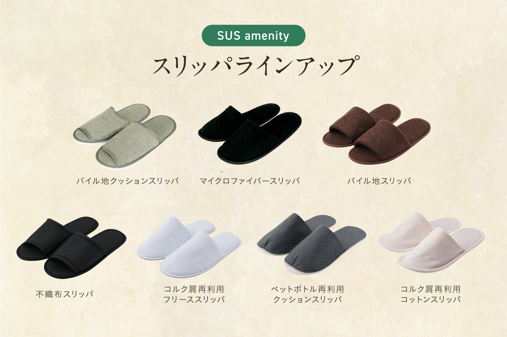 変化する社会やお客様の要望の状況にあわせ、今求められるグッズを展開してきたSUS amenityブランド。当ブランドは、スリッパ以外にも40種類以上のアメニティを展開しています。