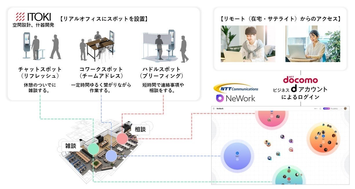今回の「office surf」を用いた実証実験において、イトーキが本実証実験用に什器の開発を行い、カフェやラウンジのような場所に常時オンラインワークスペースを設置します。これに、NTT Comが提供する「NeWork」とドコモが提供する「ビジネスdアカウント」を組み合わせることで、新たなログイン情報の登録やWeb会議設定の手間もなく、会話できる空間を実現します。