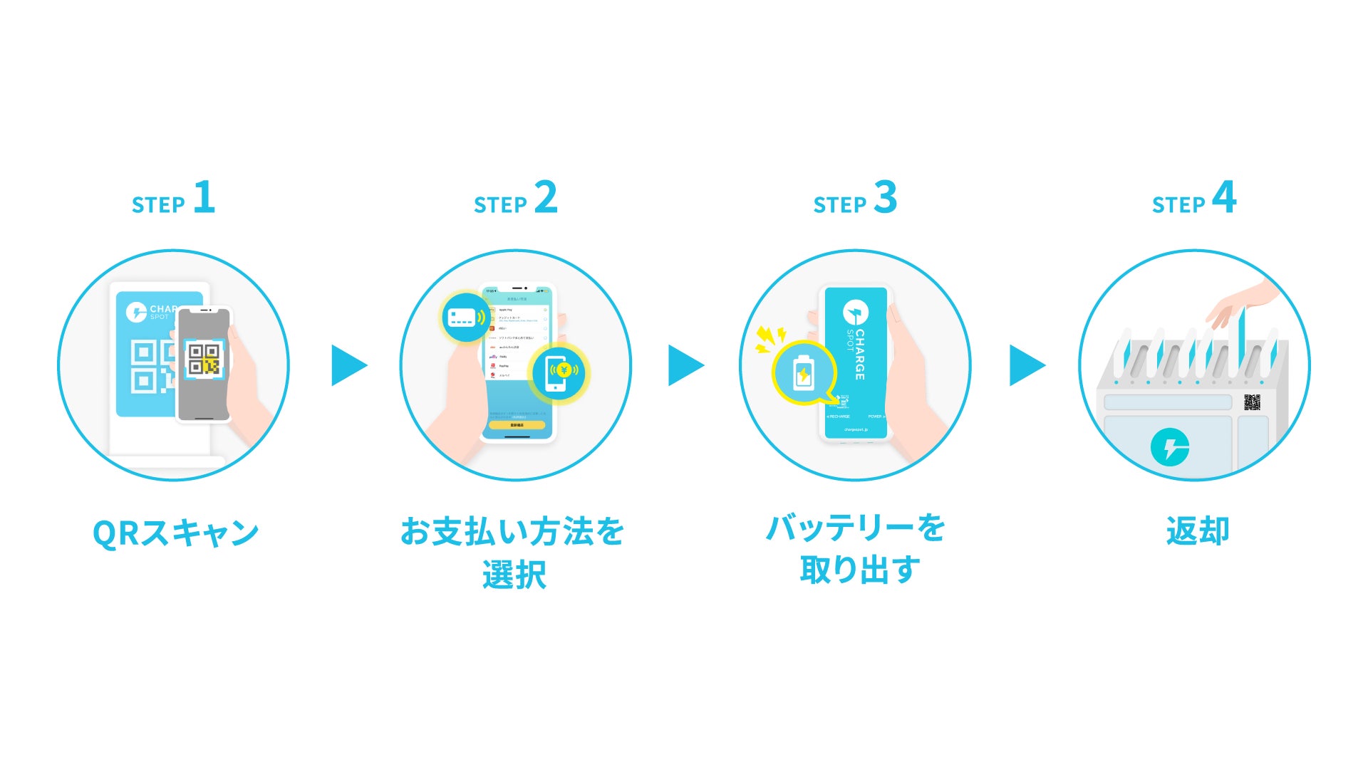 モバイルバッテリーシェアリング「ChargeSPOT」。レンタル方法は「ChargeSPOT」対応アプリでバッテリースタンドのQRをスキャンするだけの簡単操作。日本全国47都道府県に設置されており、グローバルでも香港、タイ、台湾、中国、シンガポール、ベトナム、マカオとエリアを拡大中です。