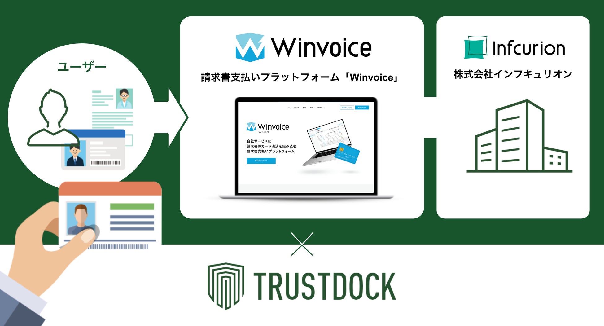 インフキュリオンは、2023年10月より開始した「Winvoice」に、TRUSTDOCKが提供するeKYC本人確認サービスを連携することで、法人確認や個人の身元確認など審査に関わる本人確認業務をスムーズに行なうことが可能となります。これにより、「Winvoice」のユーザーはスムーズかつ、安全・安心にサービスを利用できるようになります。