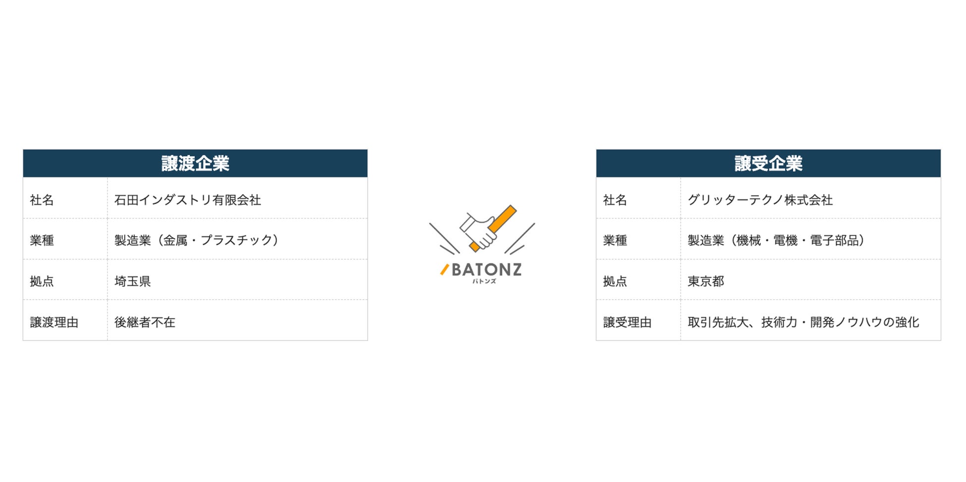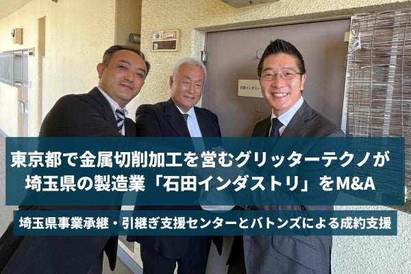 M&A総合支援プラットフォーム「BATONZ(バトンズ)」を運営する株式会社バトンズ(本社:東京都中央区、代表取締役CEO:神瀬悠一、以下バトンズ)は、埼玉県事業承継・引継ぎ支援センター(所在地:埼玉県さいたま市、統括責任者:石川峰生)とともに、石田インダストリ有限会社(所在地:埼玉県さいたま市、以下石田インダストリ)と、グリッターテクノ株式会社(本社:東京都八王子市、代表取締役:山下悟郎、以下グリッターテクノ)のM&A成約を支援したことをお知らせします。
