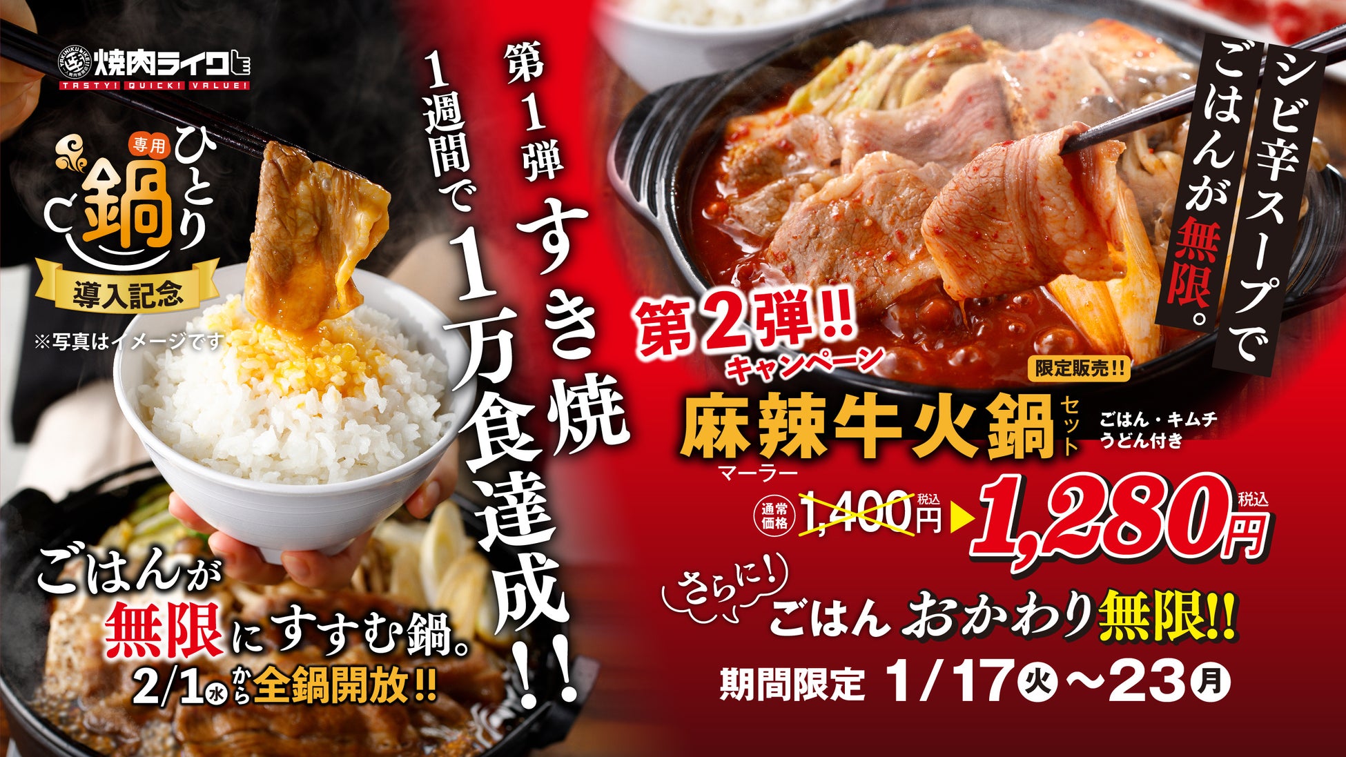 1週間で1万食突破!焼肉ライク鍋シリーズが好評!第二弾は痺れる辛さがやみつきになる「麻辣牛火鍋セット」1月17日から23日まで特別価格で販売。更にごはんおかわり無料!