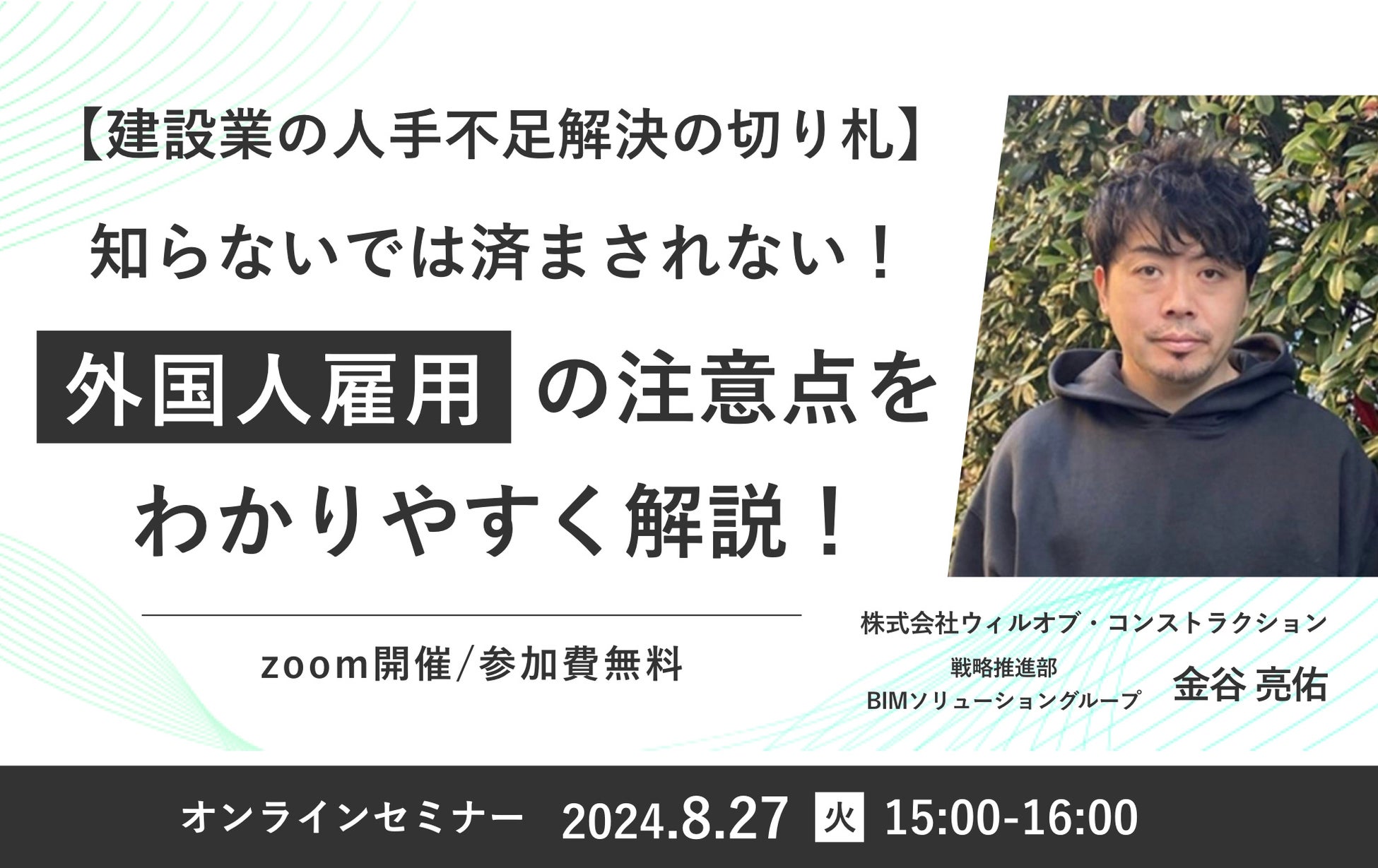ウィルグループの建設業界に特化した人材サービスを展開する株式会社ウィルオブ・コンストラクション(本社:東京都新宿区、代表取締役社長:田中 謙)は、建設業界のDXを推進する株式会社CONOC (本社:東京都渋谷区、代表取締役:山口 一)と共催で無料オンラインセミナー『【建設業の人手不足解決の切り札】知らないでは済まされない!外国人雇用の注意点をわかりやすく解説』を、2024年8月27日(火)に開催します。