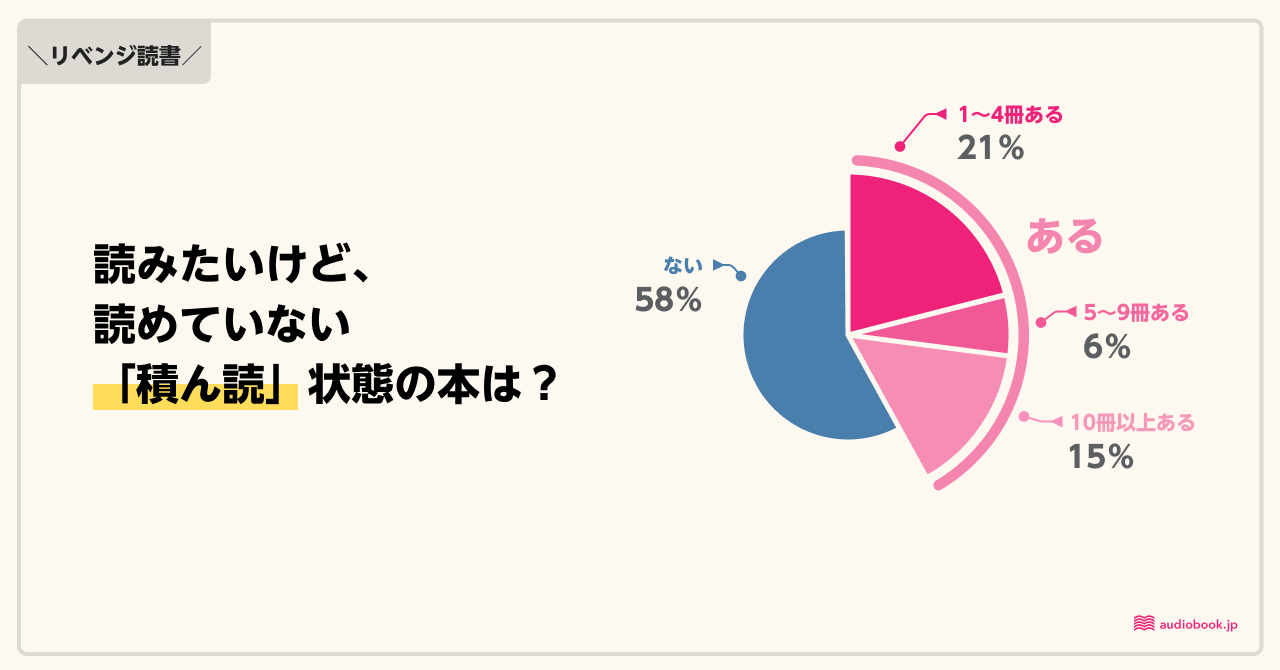 株式会社オトバンク(本社:東京都文京区、代表取締役社長:久保田裕也、以下「オトバンク」)が運営する、日本一のオーディオブック書籍ラインナップ数(※)を配信する「audiobook.jp」は、「読みたいけど読めていない本」にオーディオブックで再チャレンジする「リベンジ読書」をテーマとした「オーディオブックでリベンジ読書キャンペーン」を開催します。オトバンクの調査では、4割もの人が「読みたいけど読めていない本」いわゆる積ん読があると回答。そこで、一年を振り返り気持ちを新たにする年末年始に「リベンジ読書」に挑戦する人を応援します。※日本マーケティングリサーチ機構2022年11月調べ。日本語オーディオブック書籍ラインナップ数調査。