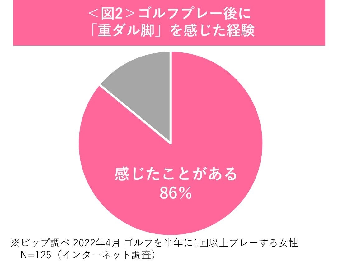 ▶ゴルフを半年に1回以上プレーする女性125名のうち、プレー後に脚の重ダルさを感じたことがある人は8割以上。多くの人がプレー後に脚の不調を感じていることが明らかに。