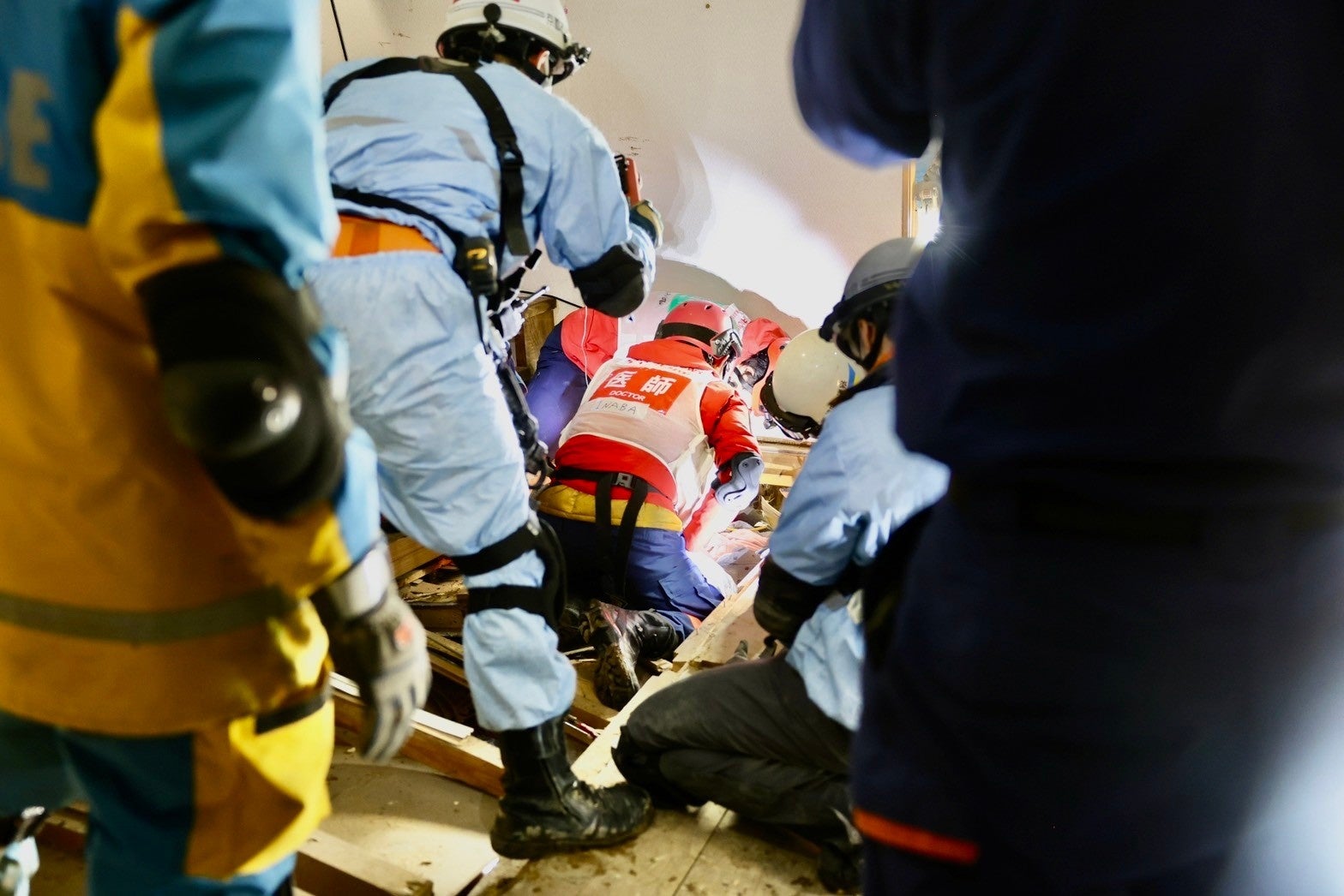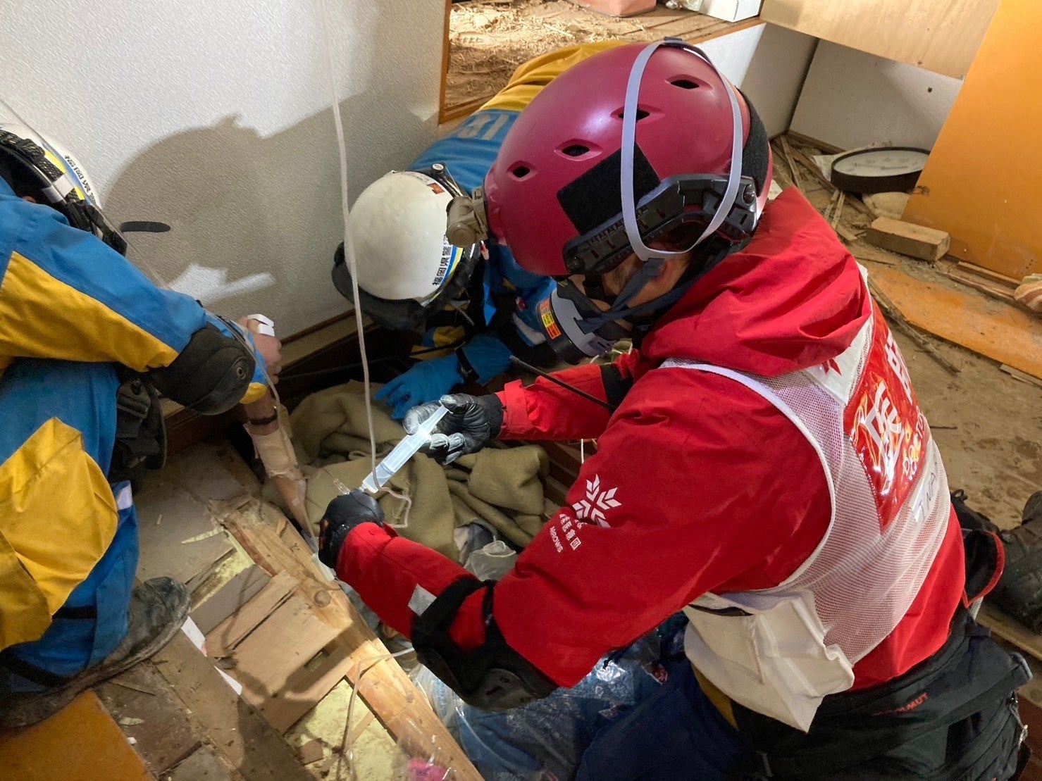 倒壊家屋のような狭く限られた空間で処置や救出を行うには、CSM(コンファインド・スペース・メディソン)と呼ばれる、特別な救助医療処置技術が必要で、その場にいたドクターの中でCSMの技術と知識を持ち合わせているのは、稲葉医師のみ。稲葉医師は、看護師1名とともに出動し、現場に急行しました。