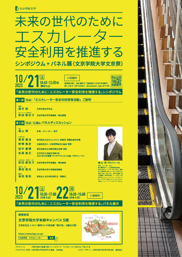 当日は、声優の福山潤様をMCに迎え、これまでエスカレーターの安全利用啓発活動に取り組んできた産官学(日立ビルシステム、東京都理学療法士協会、埼玉県、文京学院大学)の関係者が登壇し、パネルディスカッション形式で議論をしながら課題や解決策を提示していきます。また、エスカレーター安全啓発活動を示したパネル(ポスター)展示もご覧いただけます。