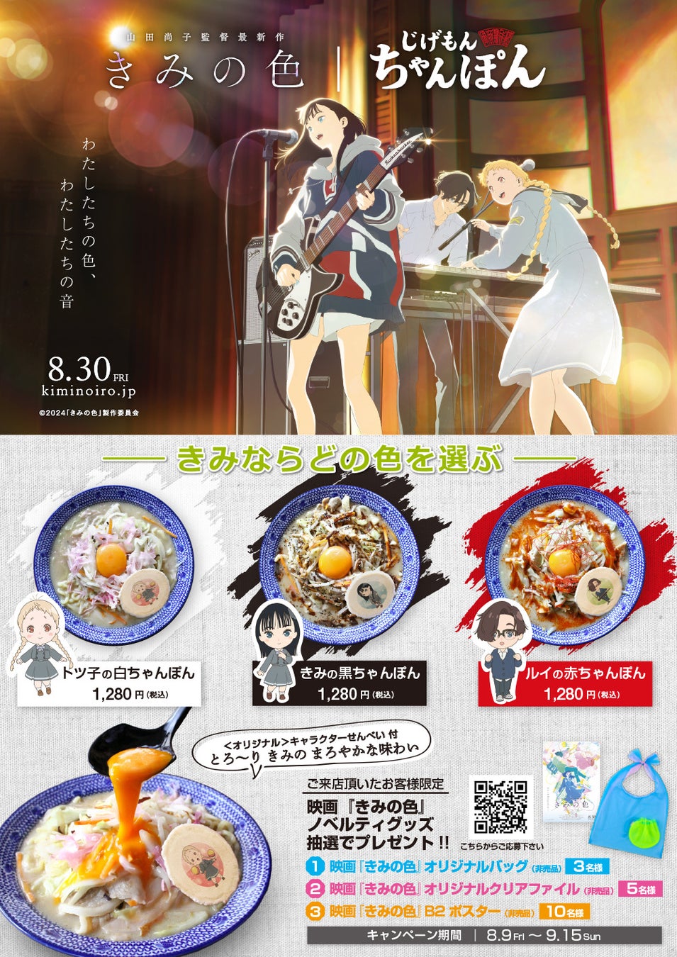 映画『きみの色』と『じげもんちゃんぽん』がタイアップ!“キミ”を乗せた3種のコラボちゃんぽんを販売するキャンペーンを8月9日(金)~9月15日(日)限定で開催