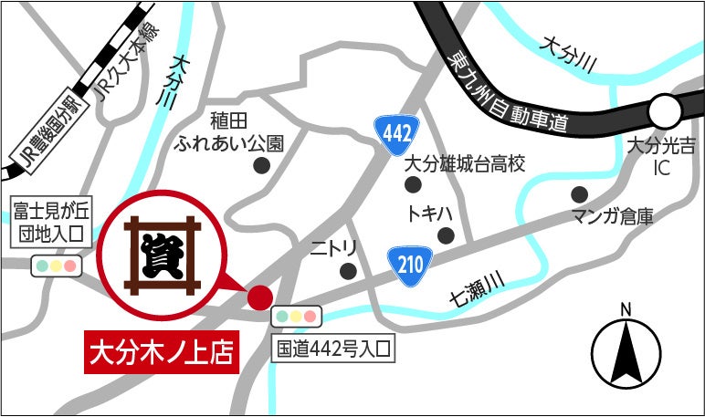 「資さんうどん大分木ノ上店」は、国道10号線からもアクセスしやすい立地です。大分自動車道「大分光吉IC」から車で約5分と利便性が高く、周辺には住宅地やい飲食店が点在します。