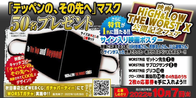 株式会社秋田書店(所在地:東京都千代田区、代表取締役社長:樋口茂)は、映画「HiGH&LOW THE WORST CROSS」が9月9日(金)から公開になることを記念して、9月8日(木)に発売となる「WORST外伝 ゼットン先生」7巻、「WORST外伝 サブロクサンタ 名もなきカラスたち」2巻、「WORST外伝 グリコ」18巻、「クローズ外伝 鳳仙花」14巻の4冊を対象とした特別プレゼントキャンペーンを実施いたします。応募の締め切りは10月7日の消印有効となります。