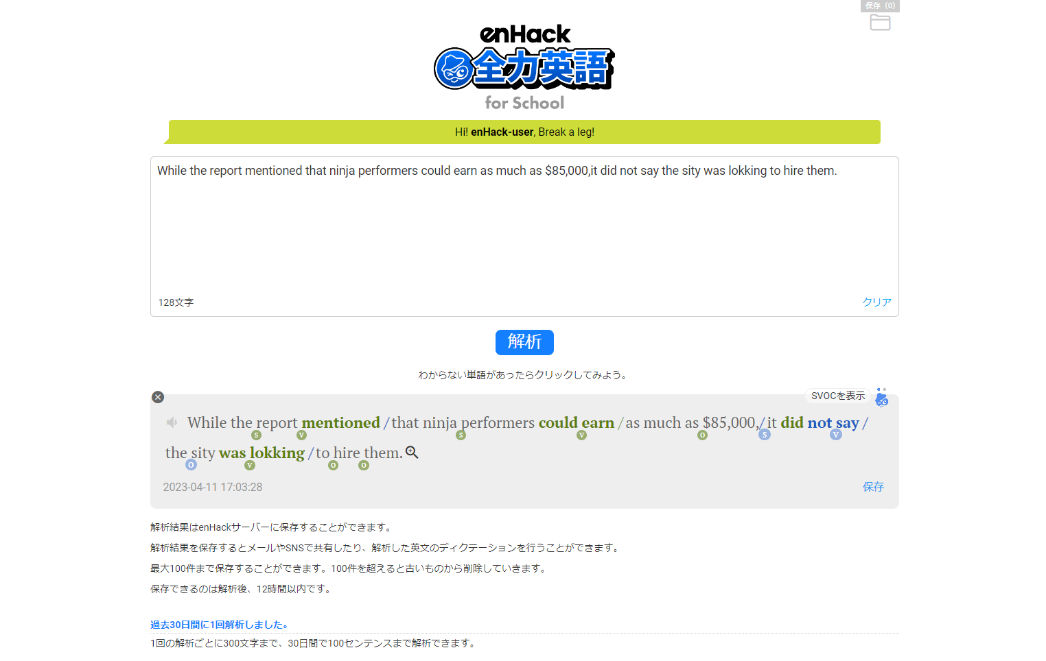 「enHack」は、教科書や問題集などさまざまな英文を解析するアプリです。英文をフォームに入力すると、その英文内の単語の意味や品詞などを表示し、文の構造を理解するのをサポートします。