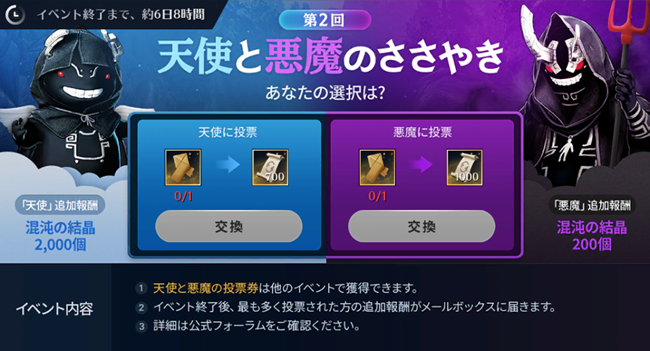 個人の報酬重視の「悪魔」か、全体の報酬重視の「天使」か、どちらかを選択して投票する「天使と悪魔のささやき」イベントが開催されます。本イベントでは「悪魔」に投票する事で「突破復旧券×1000」が、「天使」に投票する事で「突破復旧券×700」を獲得する事ができ、最終的な投票数が「悪魔」が多かった場合は「混沌の結晶×200」、天使が多かった場合は「混沌の結晶×1000」がメールボックスに届くイベントとなっています。