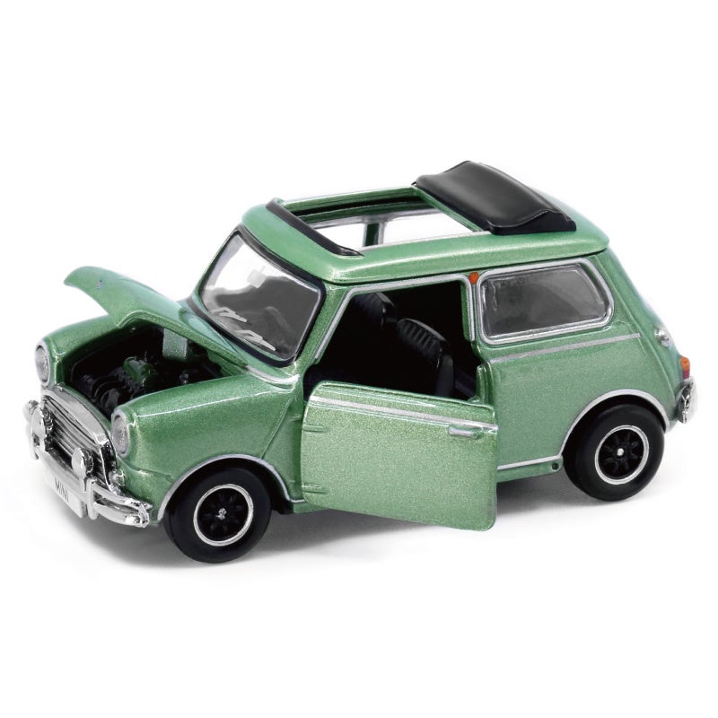 ミニカーは1/50スケールでありながらも、ハンドルや座席など内装まで精巧に再現されたミニクーパーを楽しむことができます。ホイールやバンパー、ヘッドライトも細かく再現されており、ドアが開く遊び心たっぷりのギミックも。